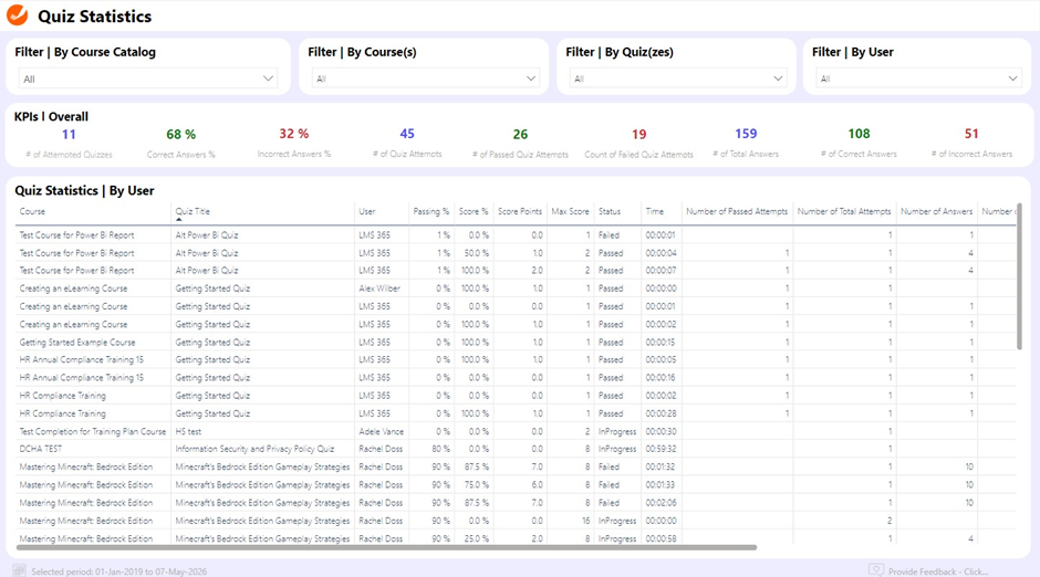 This page aggregates data from multiple quizzes to present key performance indicators (KPIs), quiz attempt statuses, training effectiveness, average scores, and more detailed insights on correct and incorrect answers by quiz.