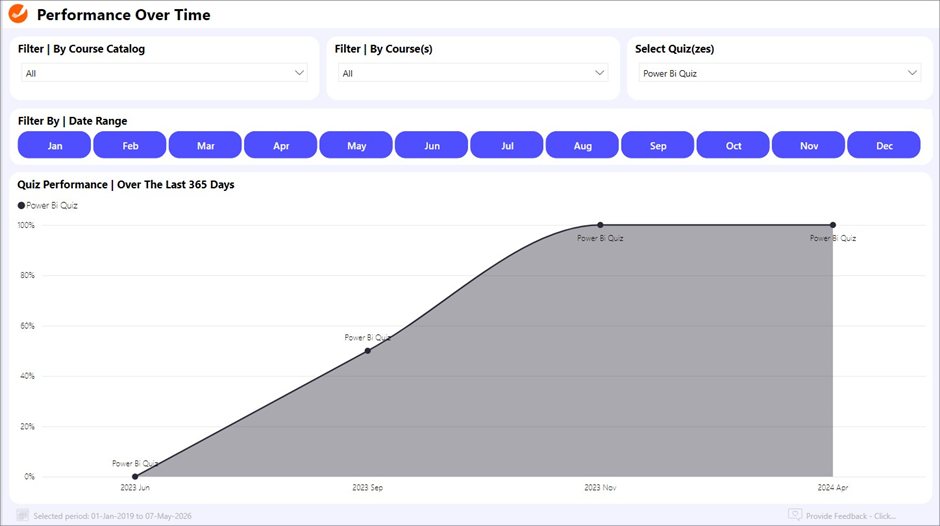 The Performance Over Time page tracks and visualizes the performance of quizzes across a selected timeframe (within 365 days). This dynamic view helps users identify trends, patterns, and areas of improvement in quiz outcomes over selected periods.