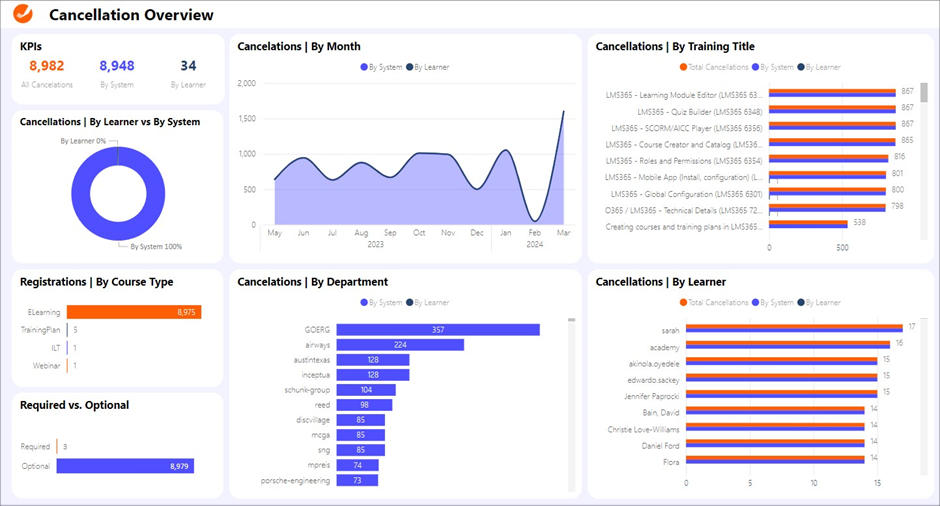 Cancellations by Department and By Learner. Bar charts provide insights into which departments and which learners are most frequently cancelling courses, indicating possible areas of concern or disengagement.