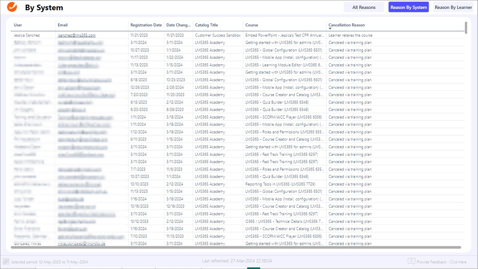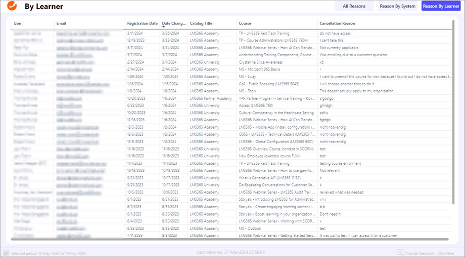 - Reason By Learner. Focuses on cancellations directly initiated by learners, offering a deeper understanding of personal or external factors that lead users to cancel their training enrollments.