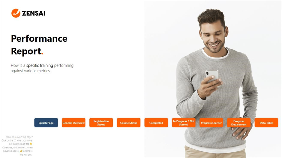 The Splash Page serves as the entry point to the Performance Report, offering users an intuitive navigation hub from which they can access various detailed reports on training performance. This page is designed to give a quick, clear view of how to explore the various aspects of training data, such as registration, course status, completion, and progress metrics.