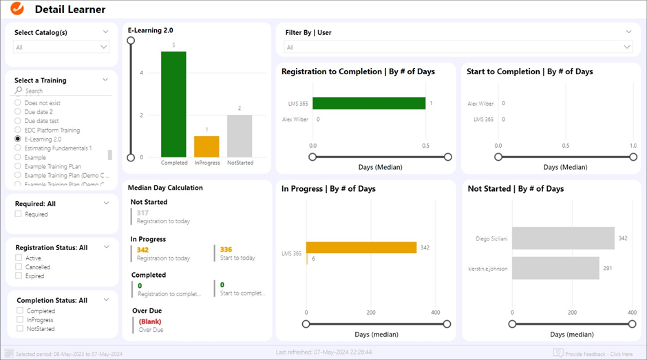In Progress | Registration Date to Today. Tracks how long current courses have been active without reaching completion, helping identify any potential stalls or slow progress in course execution.