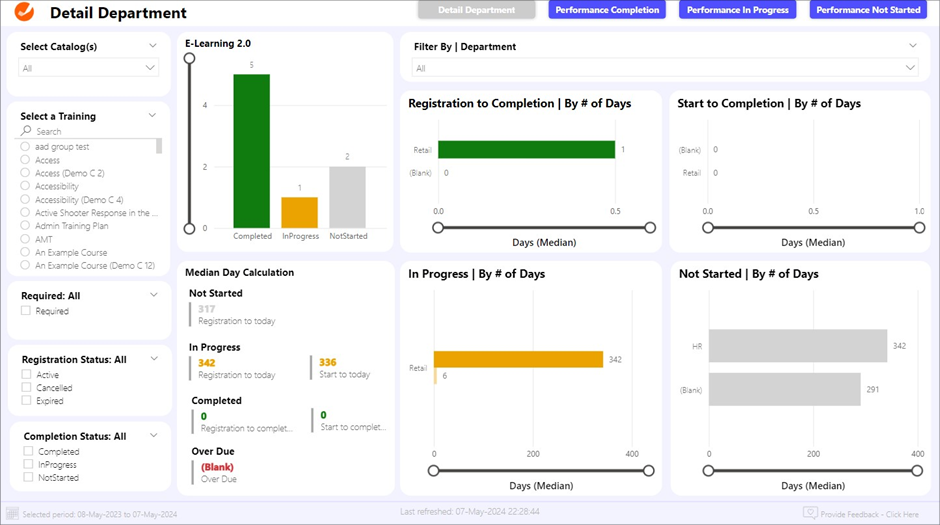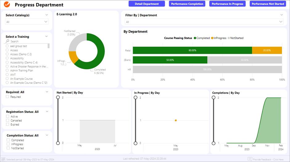 The Detail Department page provides an in-depth look at the training performance metrics within specific departments. It includes detailed metrics on course completion, registration to completion times, and the status of courses (completed, in progress, not started), helping department heads and trainers to monitor and improve the effectiveness of their training programs. This page can be accessed from the button on the top of the Progress Department page.