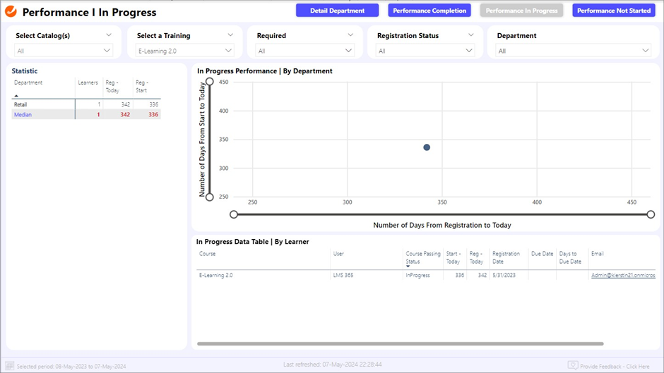 In Progress Performance | By Department. A scatter graph that represents the number of days from the start of the training to the current date for each department, indicating how long employees have been engaged with the training.