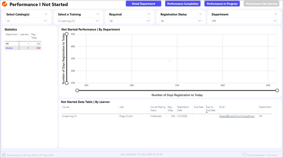 The Performance | Not Started page is designed to track and analyze training sessions that have been scheduled but have not yet commenced within the organization. This page helps in understanding the preparatory status and scheduling efficacy and identifies any delays in the initiation of training programs.