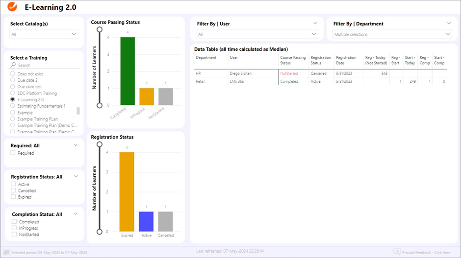 Data Table. Provides detailed information about each learner’s course status, including course passing status, registration status, and key dates. This table is crucial for administrators to monitor individual progress and intervene if necessary.