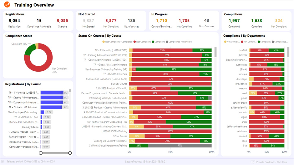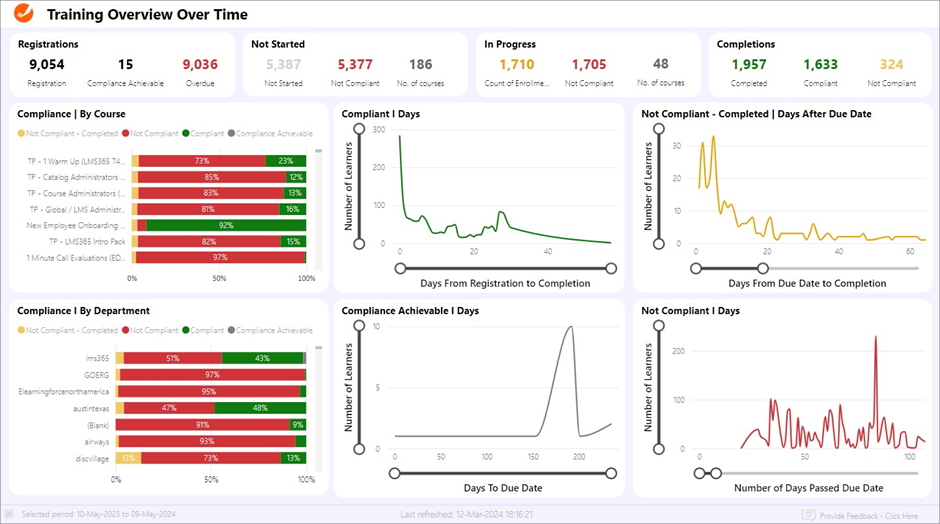 - Registrations and Compliance Status. Charts and tables display the number of enrollments that are compliant or not compliant providing a clear picture of ongoing training initiatives.