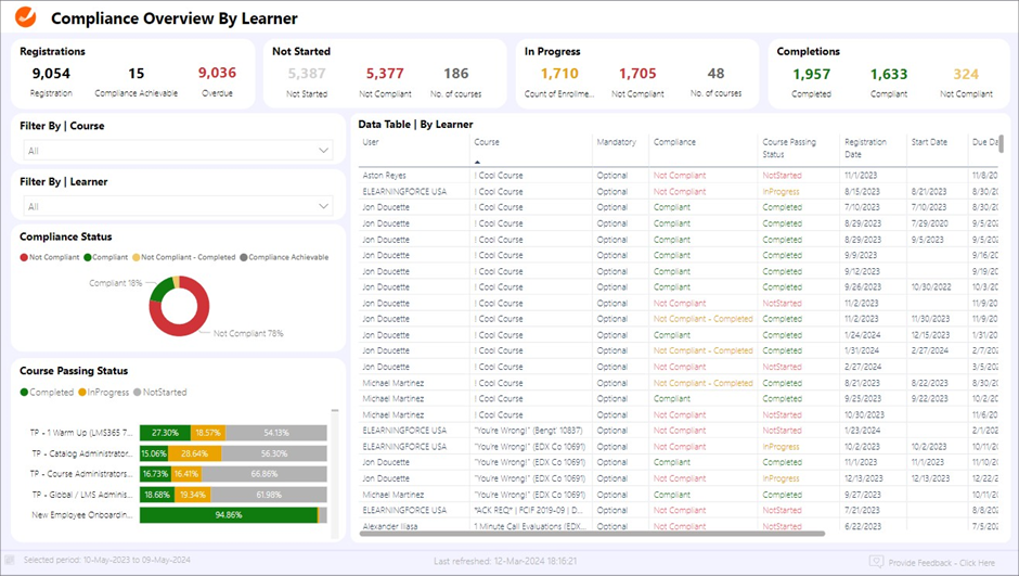 - Learner. Get insights into compliance metrics for specific learner(s) or all learners.