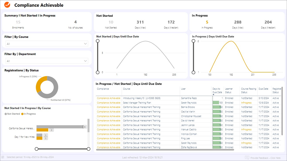 - Summary | Not Started | In Progress. Provides quick numeric summaries of courses that are yet to begin and those that are ongoing, helping to gauge the workload and compliance risk.