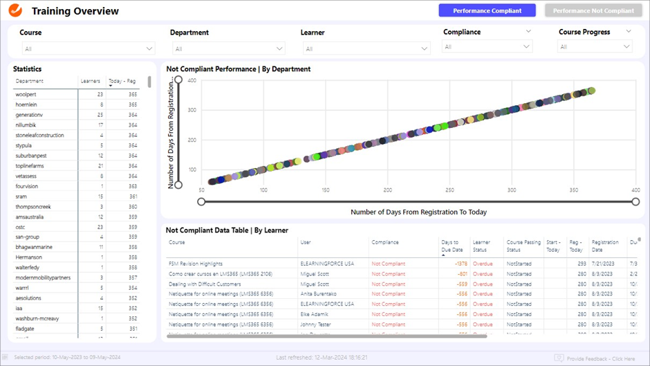 - Not Compliant Performance By Department. A scatter plot mapping the number of days from registration to today against each department, which illustrates how long non-compliance has been an issue within specific departments.
