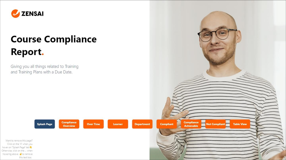 The Splash Page serves as the entry point to the Performance Report, offering users an intuitive navigation hub from which they can access various detailed reports on training performance. This page is designed to give a quick, clear view of how to explore the various aspects of training data, such as registration, course status, completion, and progress metrics.