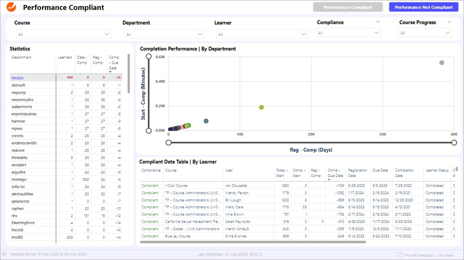 - Compliant Date Table | By Learner. Provides detailed compliance data for each learner, listing out the courses they have taken, their completion status, and relevant dates. This table is useful for tracking individual compliance and identifying learners who may need additional support.