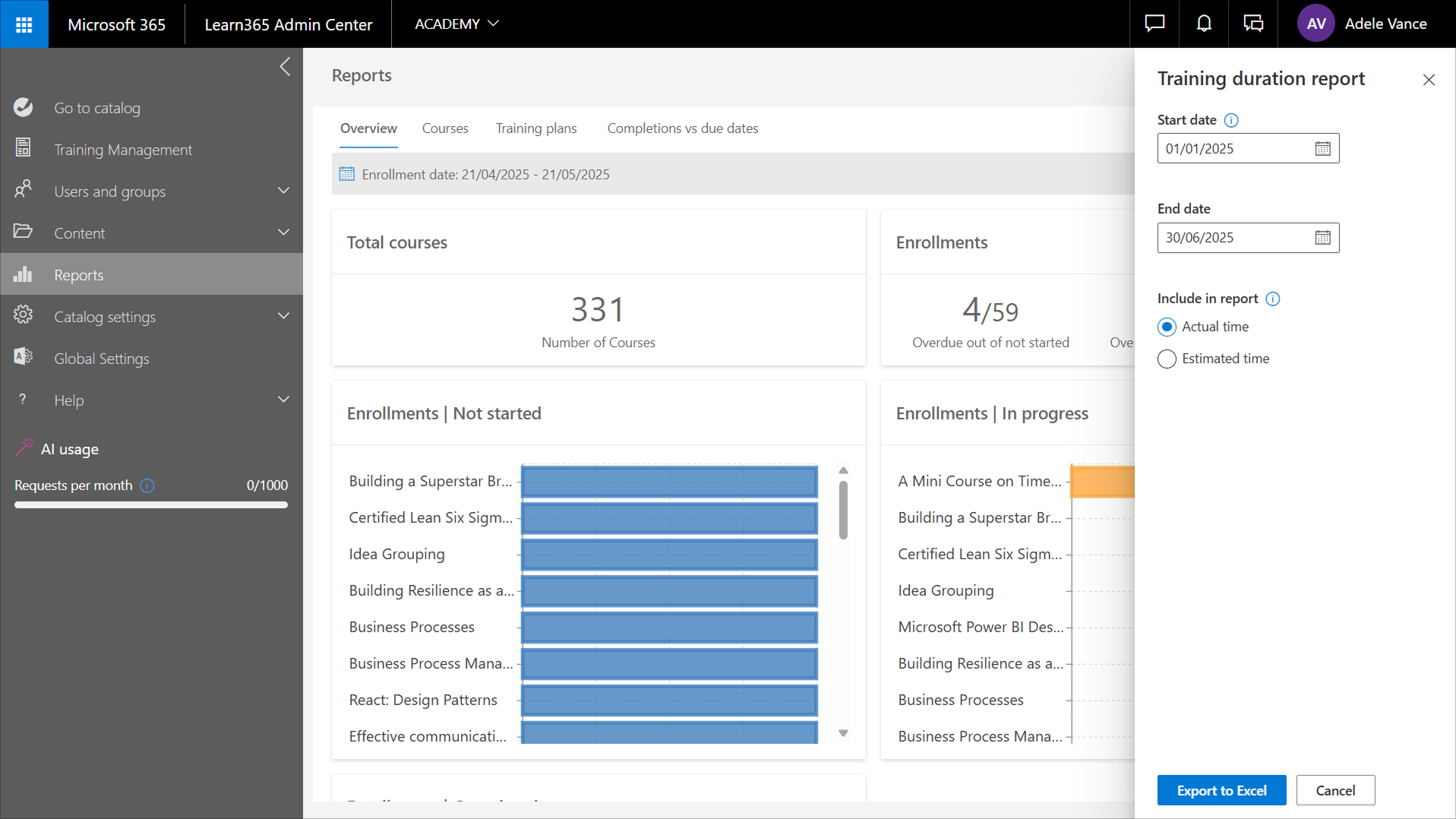 If this option in Global Settings is selected, when catalog admins run the Training duration report, they can choose whether they want to show the expected or actual amount of time learners spend in courses. For information about how LMS admins and Microsoft 365 global admins can enable real-time tracking, see Enable and disable real-time tracking for the Training duration report.
