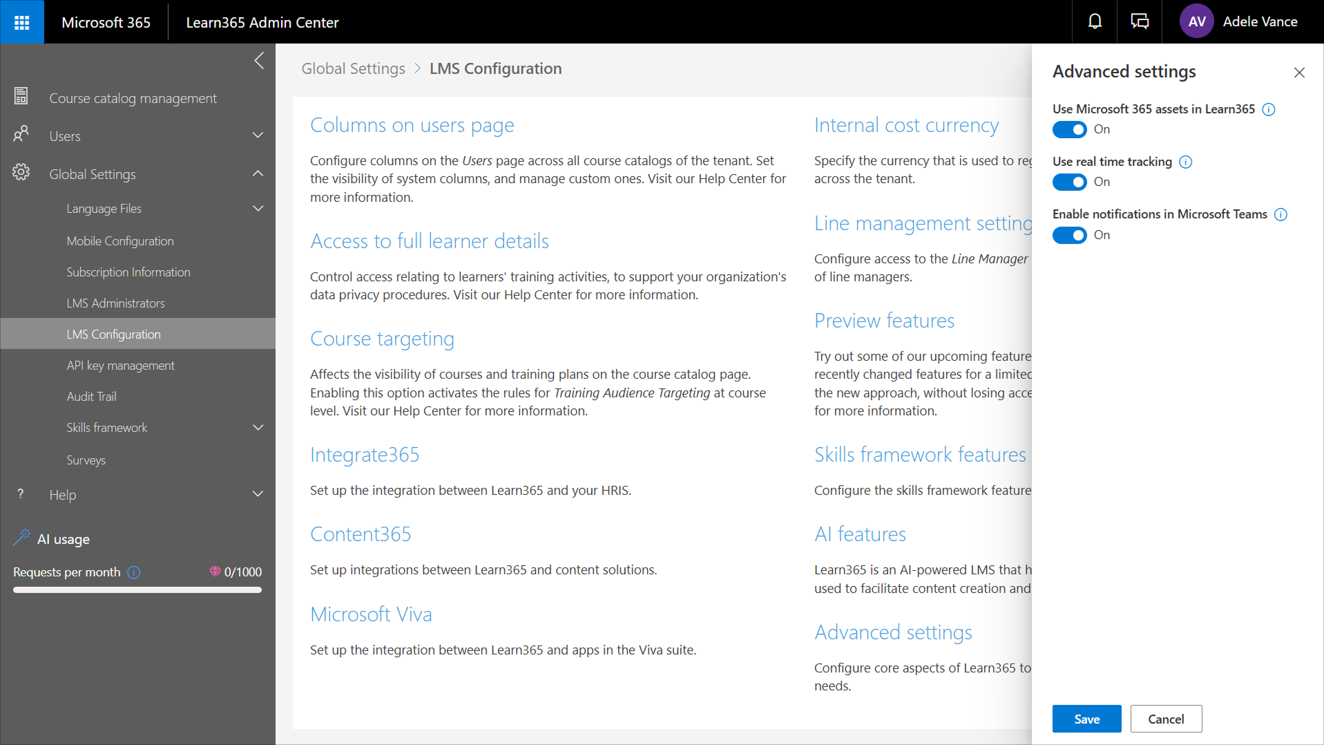 1. In the Learn365 Admin Center, go to Global Settings > LMS Configuration > Advanced settings.