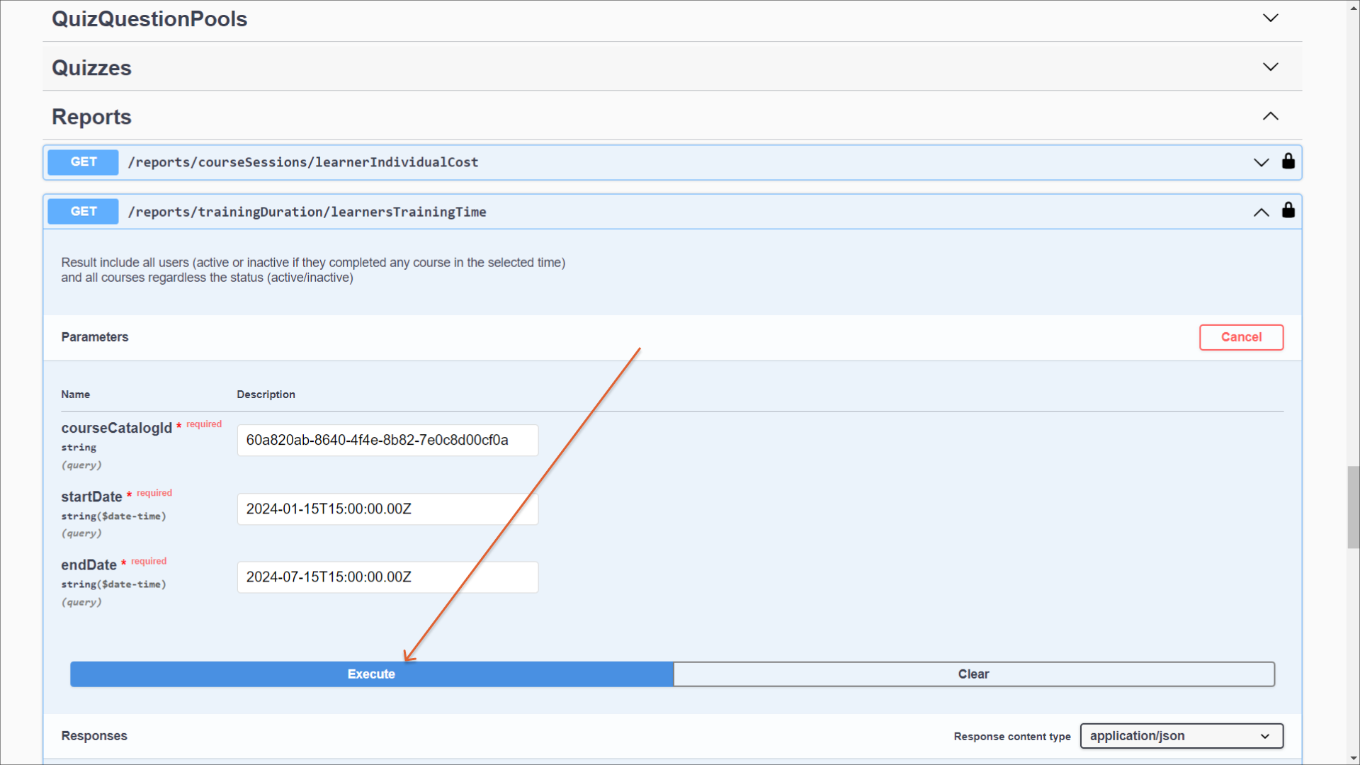 2. In the Reports section, select the GET /reports/trainingDuration/learnersTrainingDuration endpoint and select Try it out in the top right-hand corner.