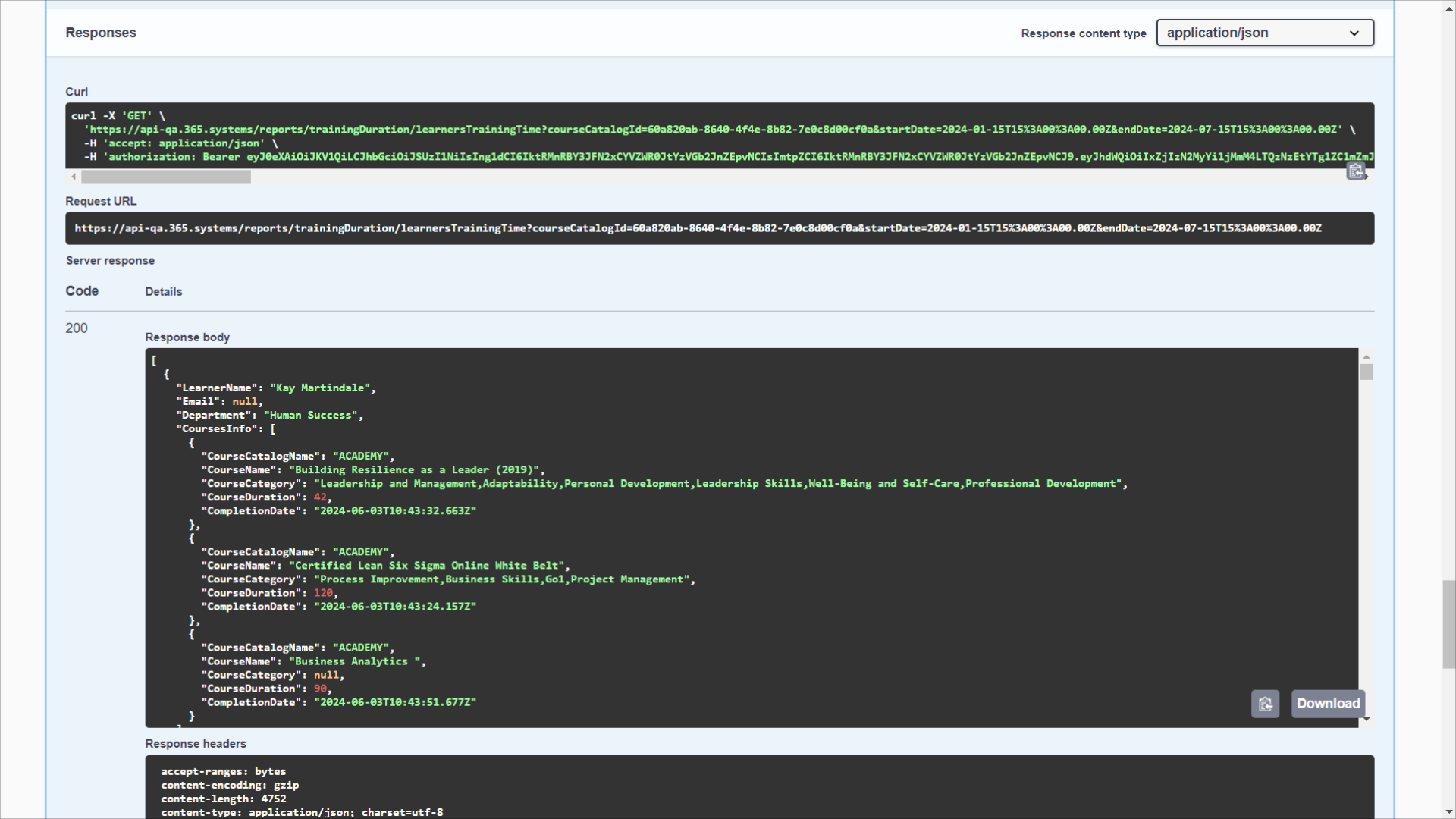 - 200 code with a list of learning sessions and training duration data in its body means the successful response.