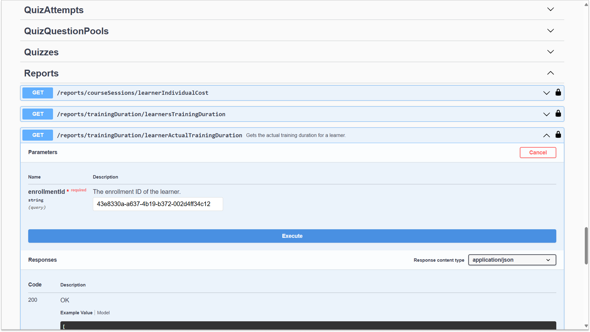 2. In the Reports section, select the GET /reports/trainingDuration/learnerActualTrainingDuration endpoint and select Try it out in the top right-hand corner.