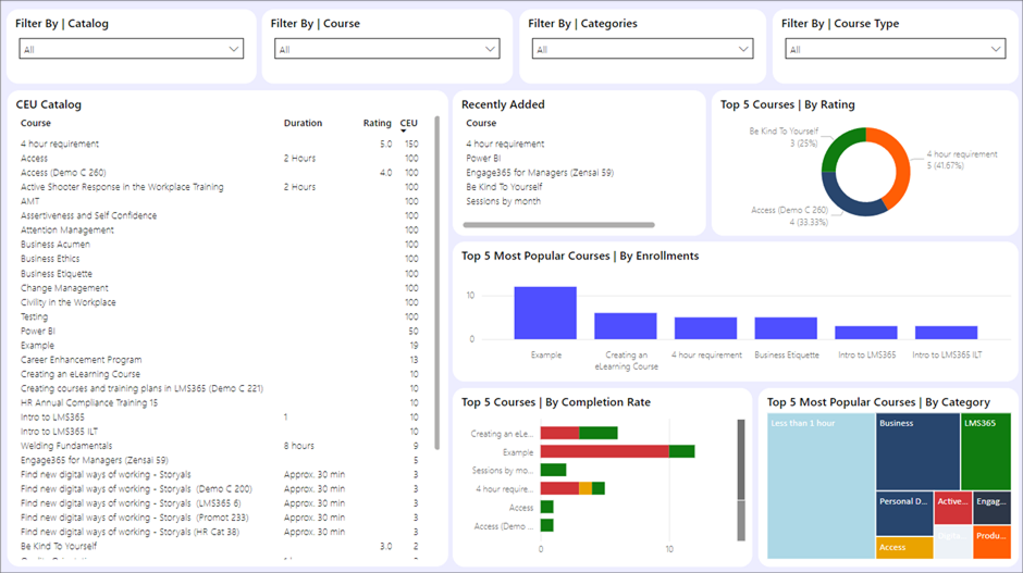The purpose of the CEU Report is to deliver a thorough analysis of CEUs within your organization, helping you monitor progress, identify trends, and make informed decisions. The report is intended to give you a complete understanding of CEU distribution and course performance, allowing for data-driven strategies to optimize learning and engagement.