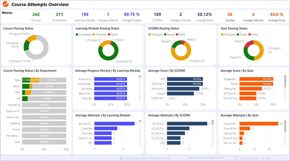 The Course Attempts Overview Power BI Report offers a comprehensive analysis of course performance and associated content. The report focuses on user interactions with learning modules, SCORM packages, and quizzes, providing key insights into learner engagement, course effectiveness, and overall training progress. The report is structured across several interactive pages: Splash Page, Course Attempts Overview, Associated Content, Learning Module Attempts, SCORM Attempts, and Quiz Attempts. Each section provides detailed metrics and visualizations designed to help organizations assess and optimize their training strategies.