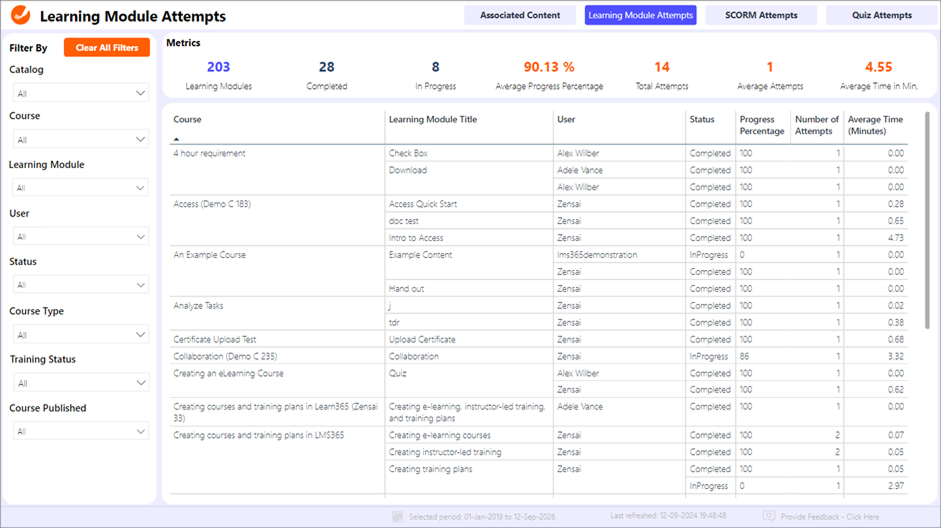 - Learning Module Attempts. Details user engagement with individual learning modules, including progress percentages and completion rates.