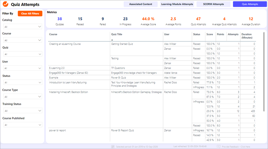Assess Assessment Effectiveness. Tracking quiz and SCORM performance data helps identify how well learners are absorbing course material. Low scores or multiple attempts may indicate that certain assessments need to be revised for clarity or better alignment with learning objectives.