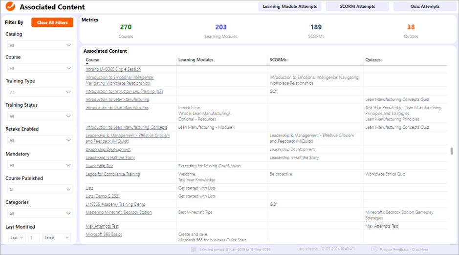 The Associated Content Page features a dynamic and interactive data table, complemented by intuitive filters that allow users to refine the displayed data according to specific needs. Users can apply filters based on parameters such as catalog, training type, training status, retake enabled settings, mandatory status, publishing status and course last modified date. As users adjust these filters, the data table and associated visualizations update instantly, providing tailored insights into how content supports learner engagement and course outcomes.