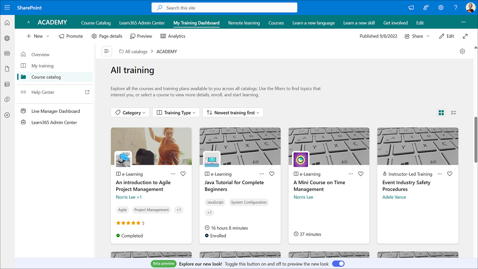 We have another update to the new UI this month. We’ve added more context to course cards in the Learn365 catalog to help learners make informed decisions at a glance. Cards now display: