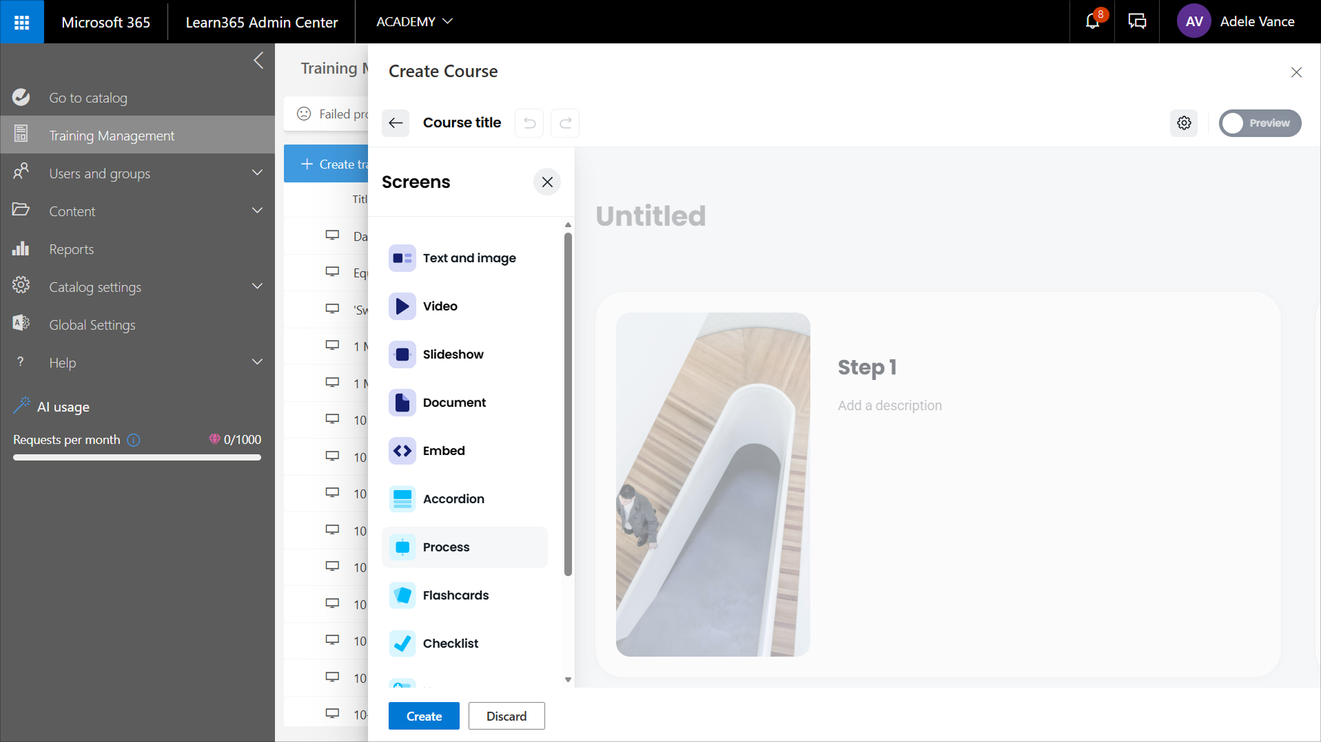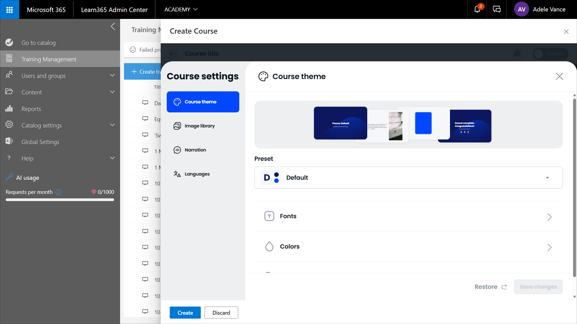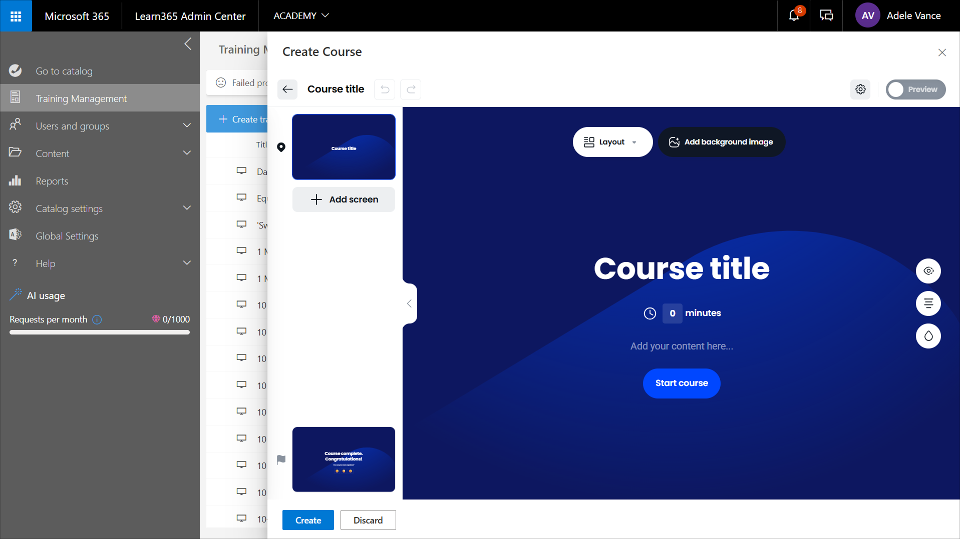 Catalog admins don't have to create an entire Content365 Authoring course in one sitting. They can start to prepare a course and return to it another time to make more changes. To do this, catalog admins select Create at the bottom of the panel to create the course in the current catalog in Learn365. Admins can return later to edit the course via the Learn365 Admin Center > Training Management > select the relevant course > Edit with Content365 Authoring.