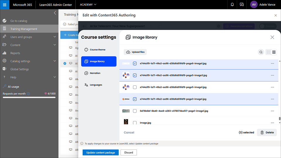 The image library is a centralized media hub that enables you to upload images once, then add them to any of your Content365 Authoring courses. It also enables you to view and manage images, edit image titles, and add tags and alt text.