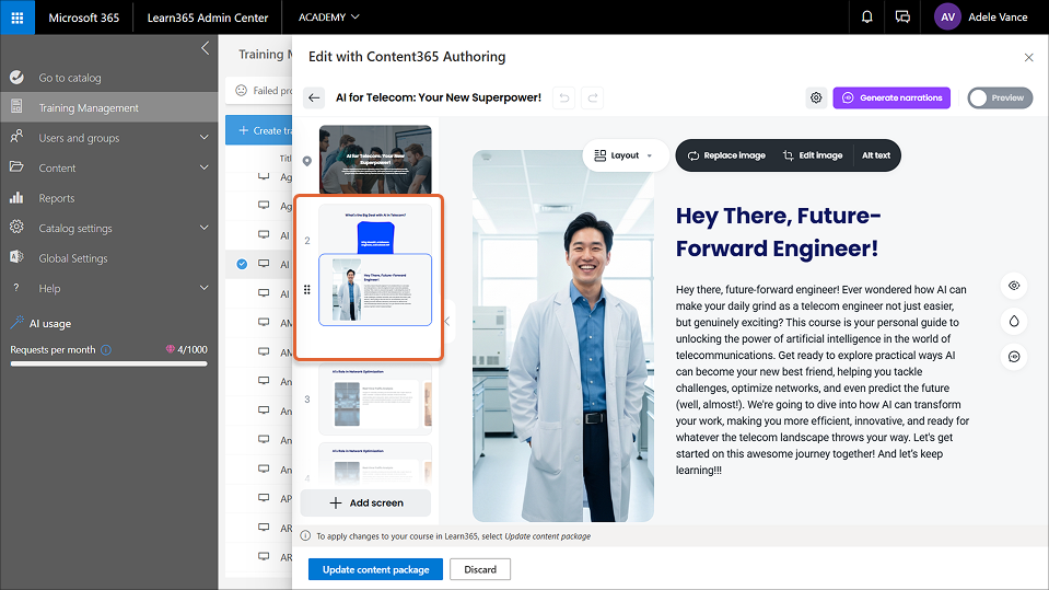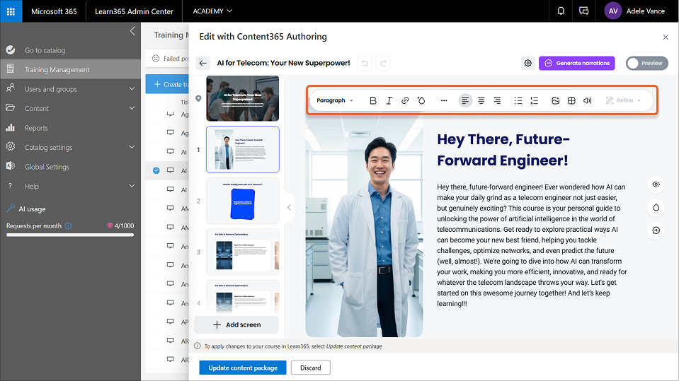 • Narration. Add an engaging, spoken version of your Content365 Authoring course, enhancing accessibility and helping learners follow content more easily. For more information, see this article.