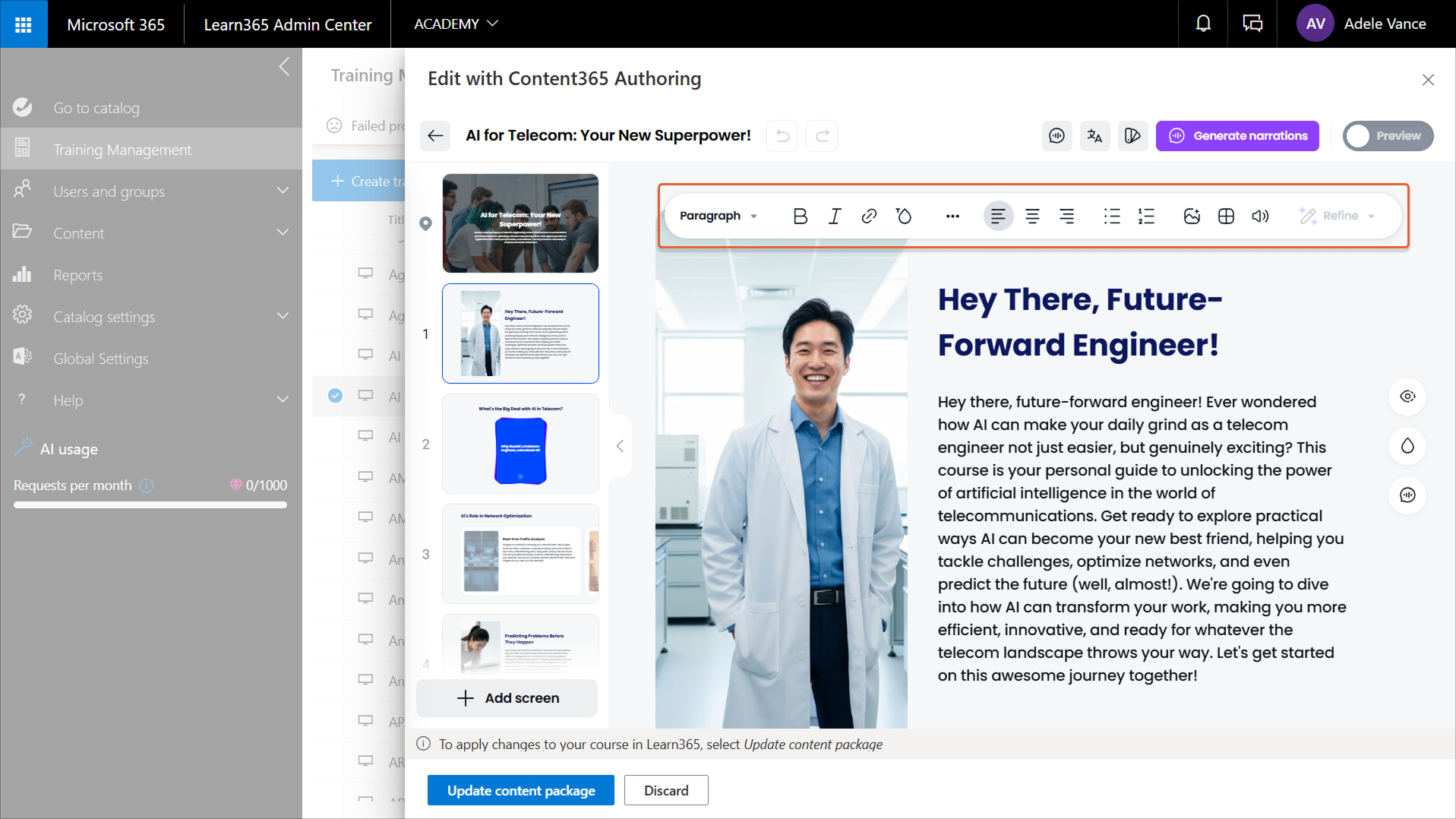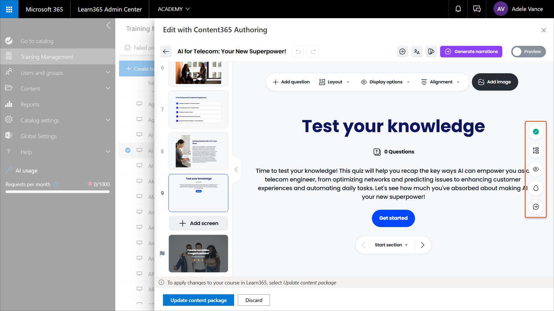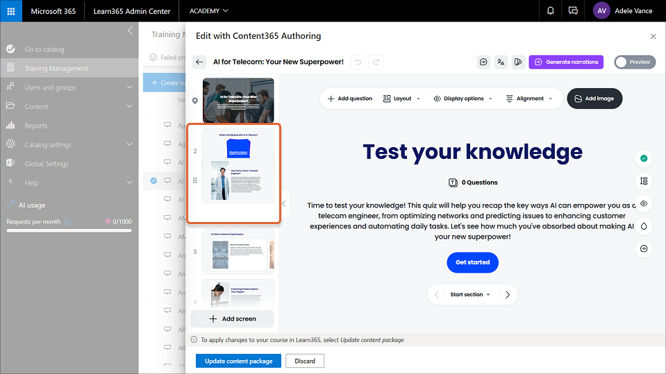 After a catalog admin creates a course in Content365 Authoring, or after admins create a content package and add it to an existing Learn365 course, they can make further changes. For example, they might want to add, edit, format, or remove content, change the screen layout, and update the branding to align with that of your organization.
