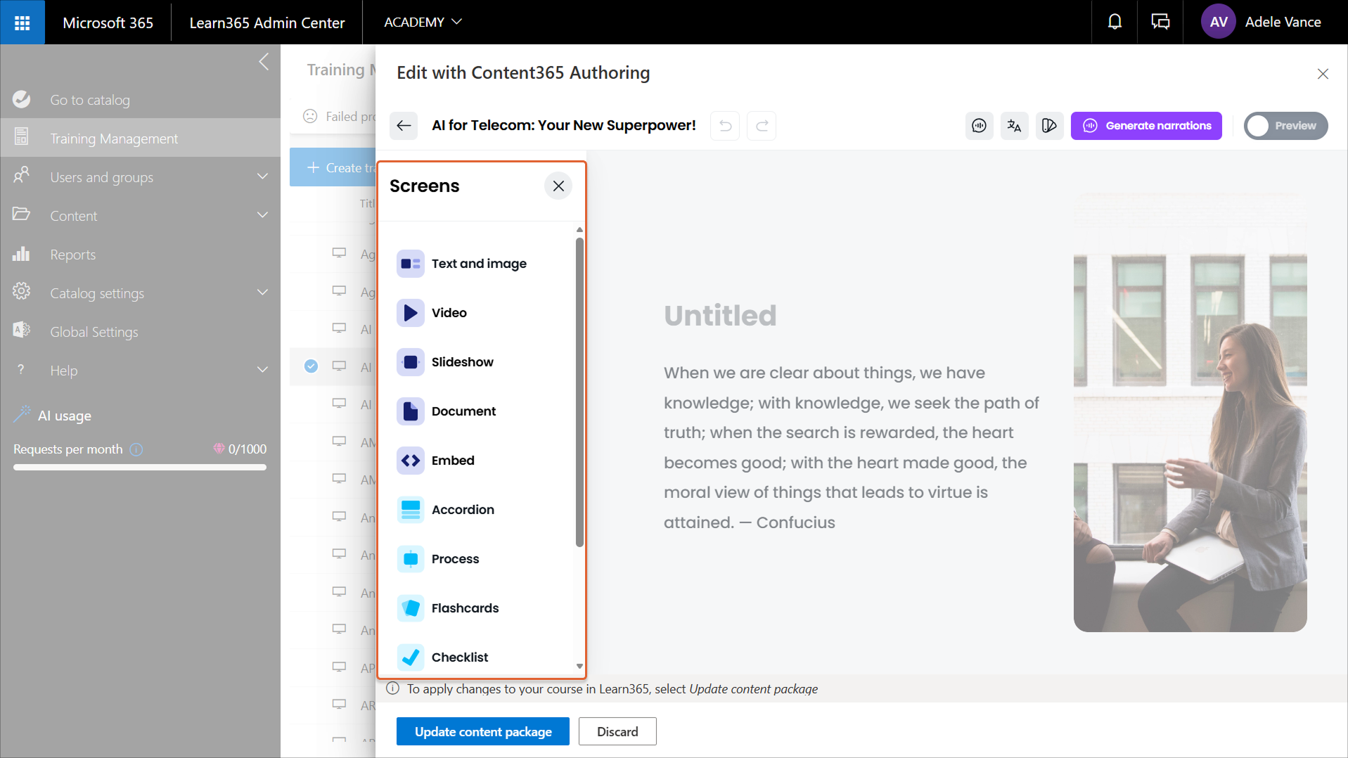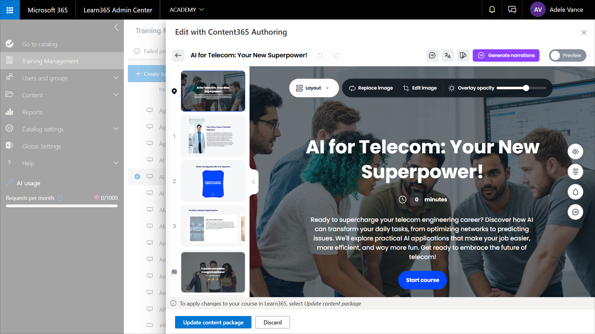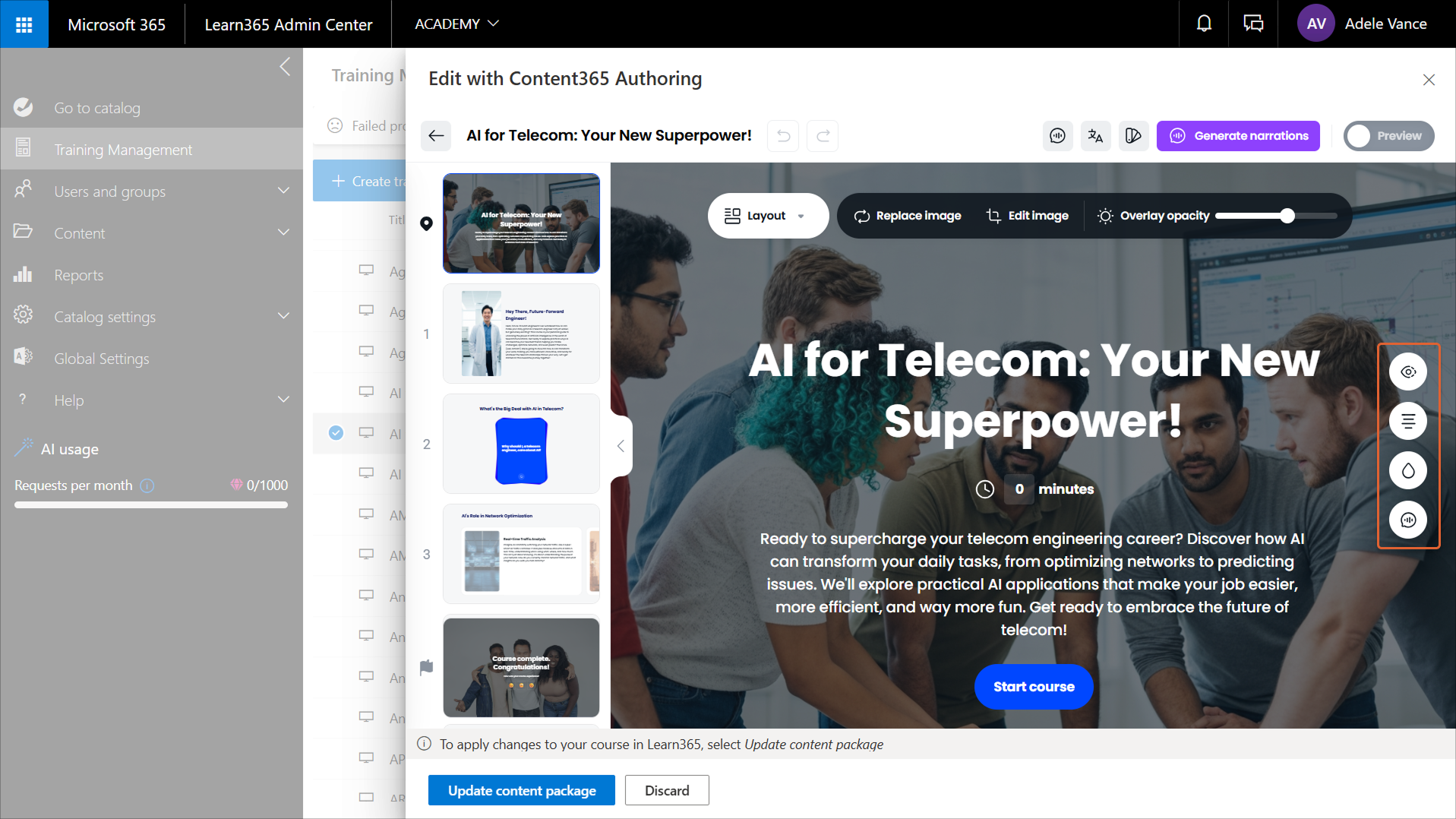 After a catalog admin creates a course in Content365 Authoring, or after admins create a content package and add it to an existing Learn365 course, they can make further changes. For example, they might want to add, edit, format, or remove content, change the screen layout, and update the branding to align with that of your organization.