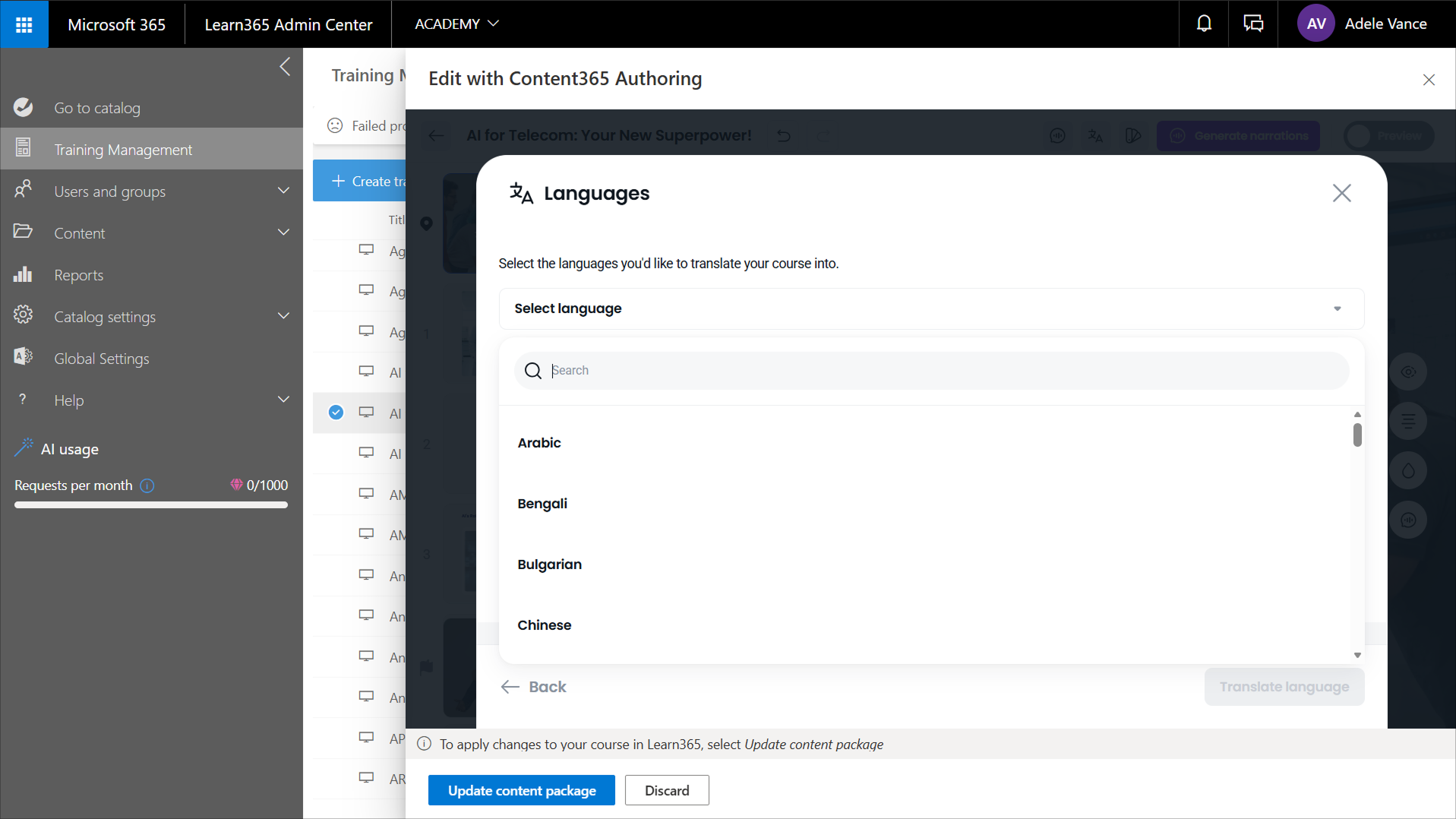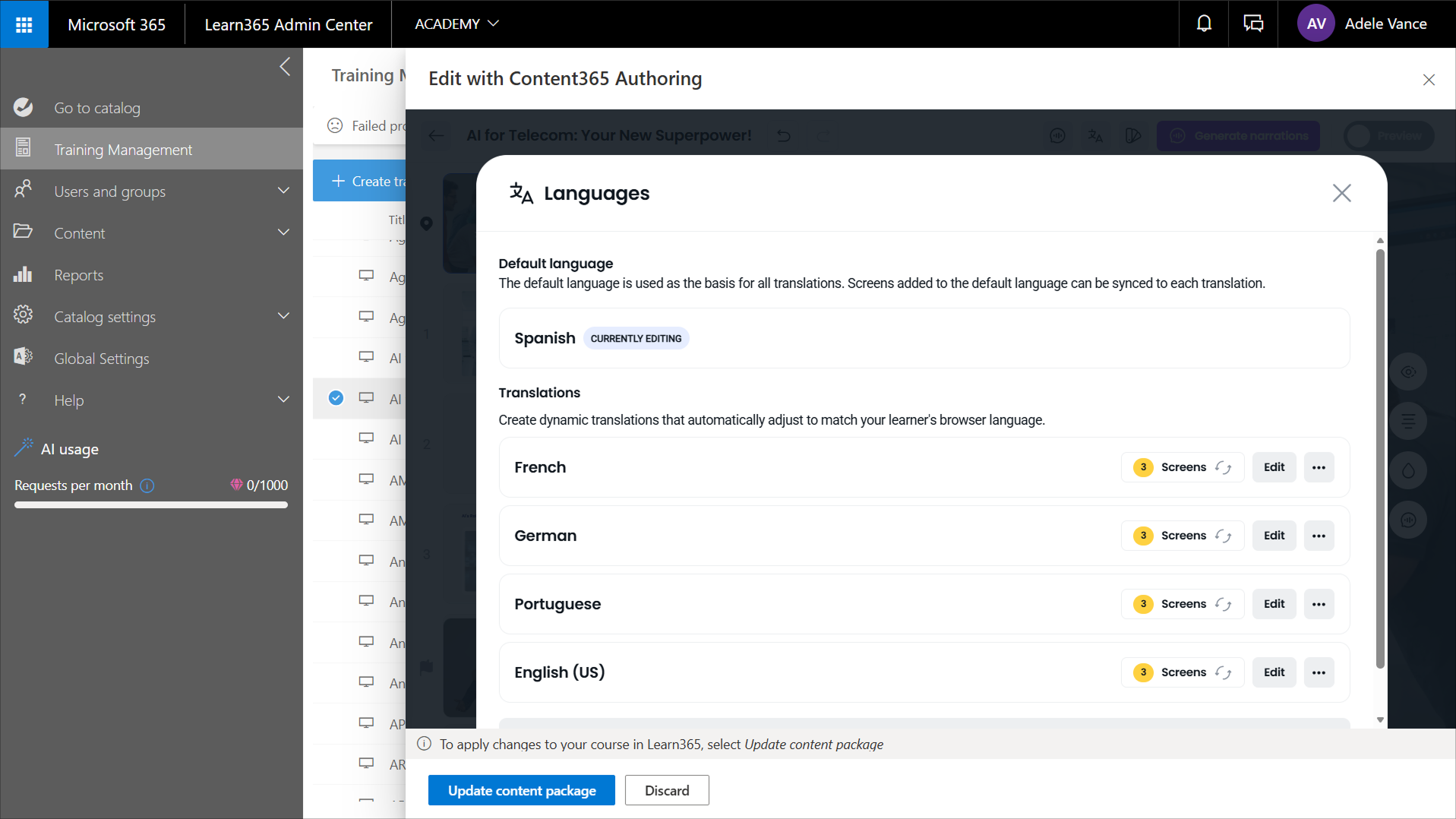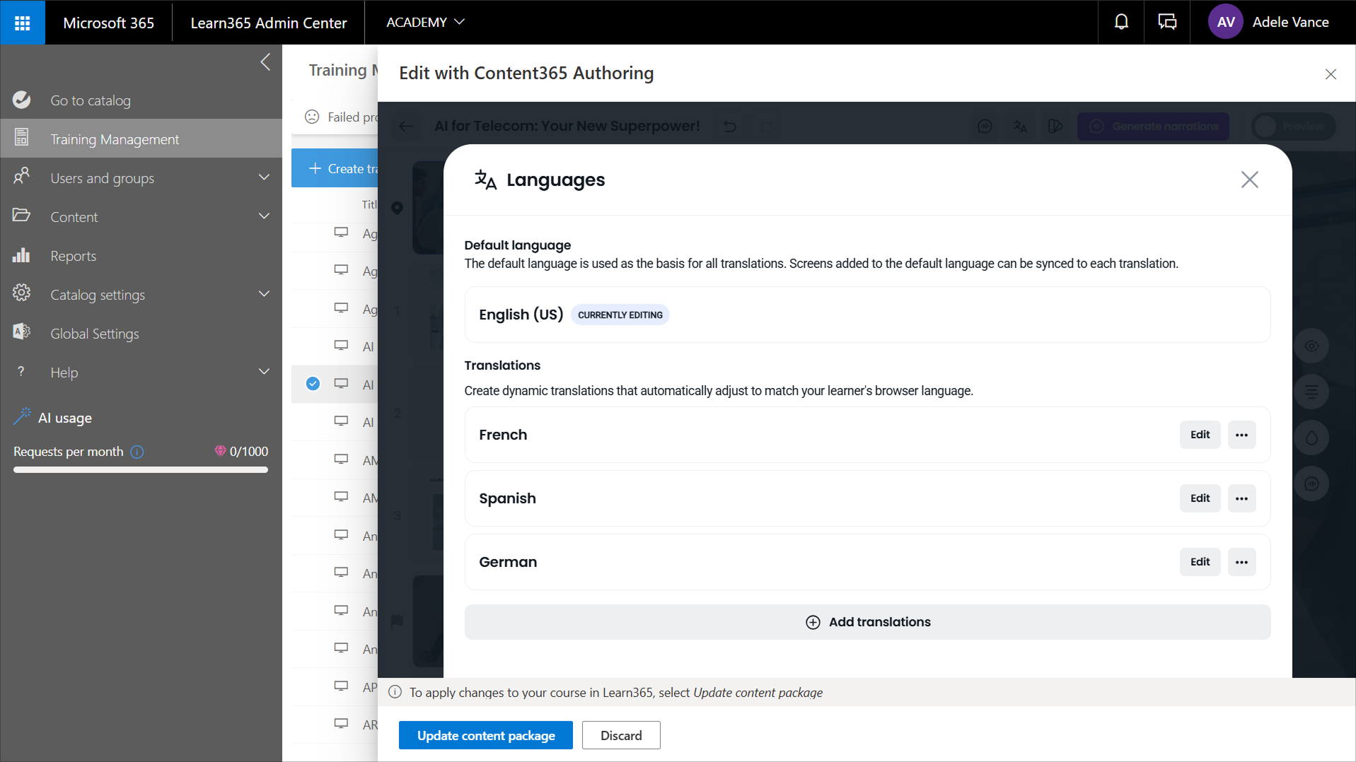 - If you add translations after a course is created, translations are added to the course in Learn365 only when you choose to update the associated content package. For more information, see Next steps.