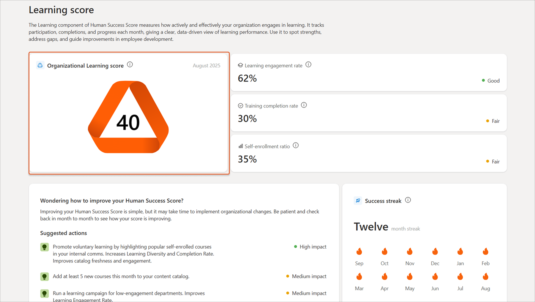 Currently, the Human Success Score relates to Learn365 only but will be further developed to incorporate Perform and Engage 365. The Learn365-related score is called the Learning score.