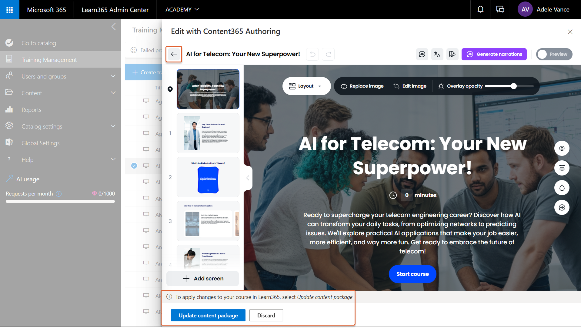 To apply the changes to your Learn365 course, select Update content package at the bottom of the panel.