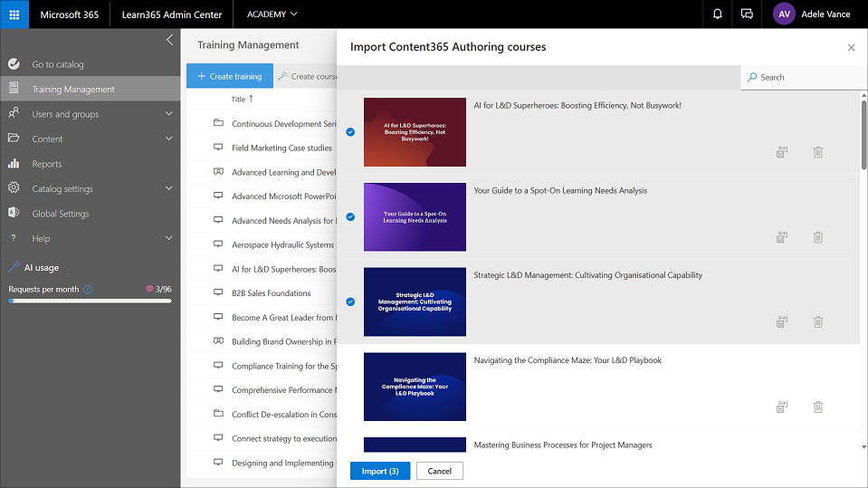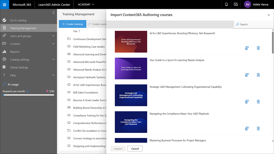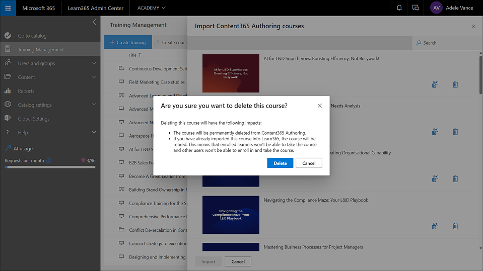 In this article, we show how catalog admins can import these Content365 Authoring courses into Learn365 so these courses can be edited going forward. We also show how catalog admins can delete courses in Content365 Authoring.