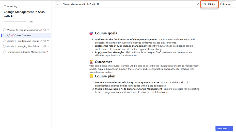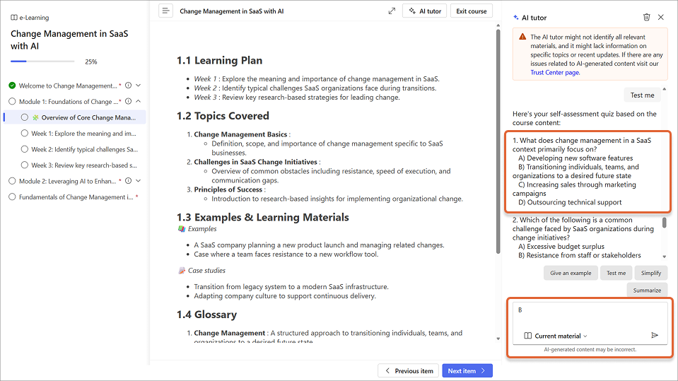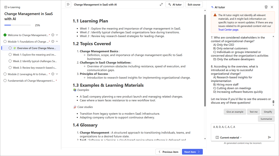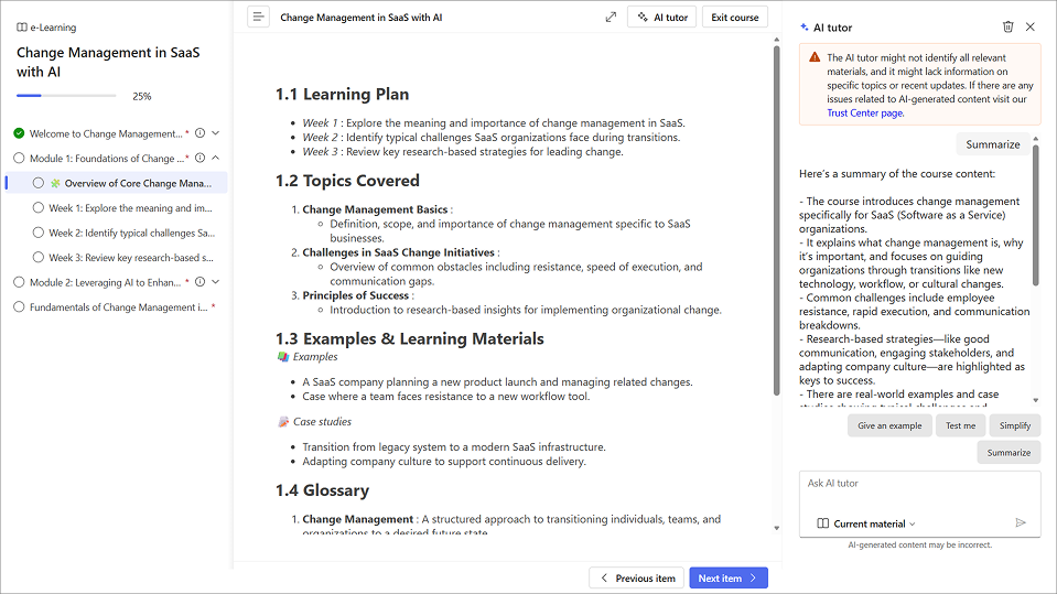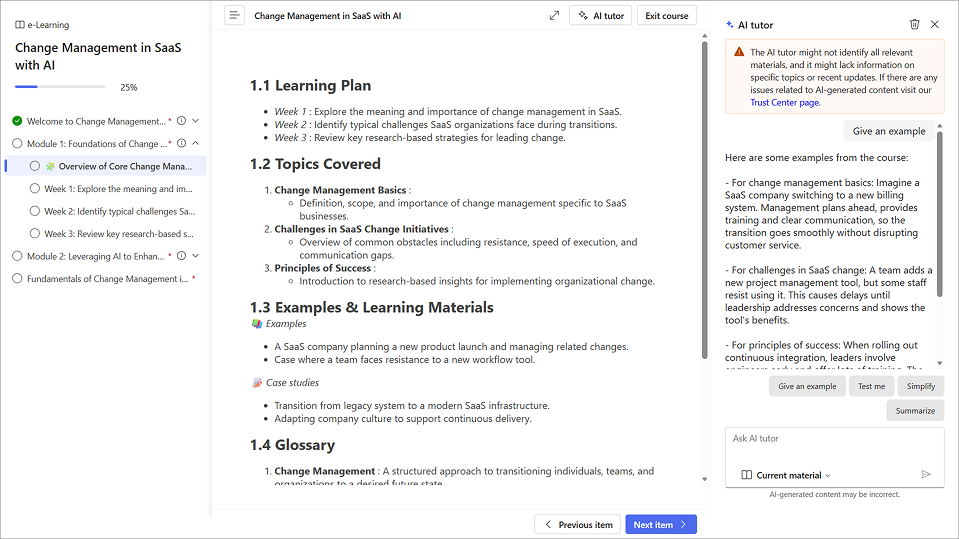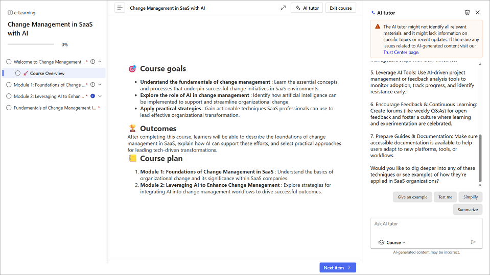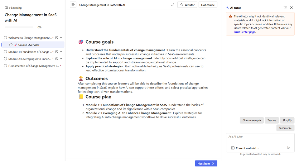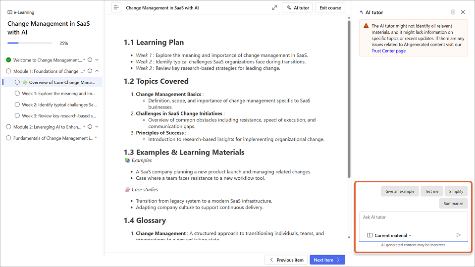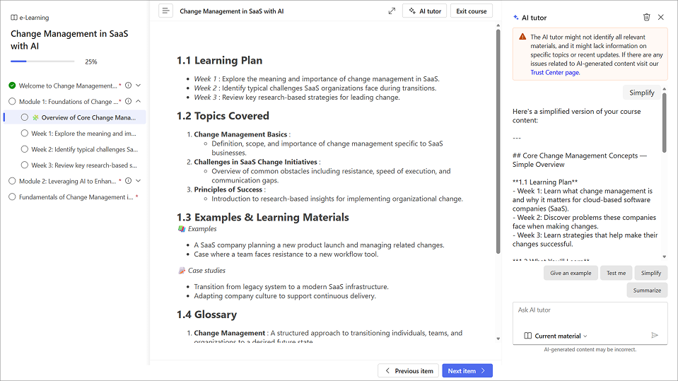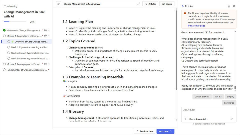 The AI tutor helps learners navigate the course and explore materials via an interactive chat experience. It turns passive content consumption into guided, interactive learning moments that can help enhance course completion rates and knowledge retention. It can help clarify, summarize, and simplify supported course content, provide real-life examples, and ask related, follow-up questions that learners can use as an unofficial knowledge check.