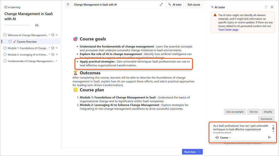 In the following example, the learner wants more information about one of the course goals, so they ask: As a SaaS professional, how can I gain actionable techniques to lead effective organizational transformation?