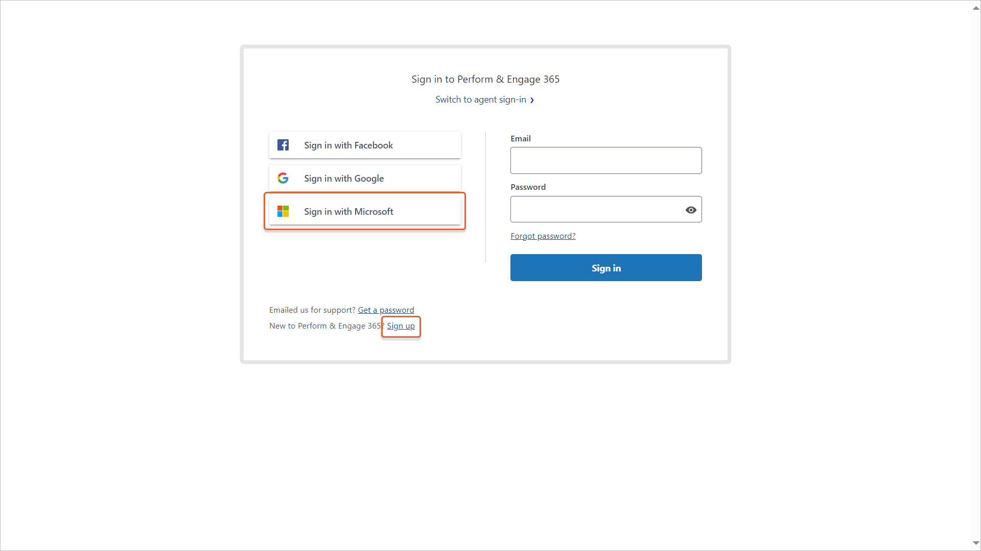 - Select Sign in with Microsoft account or work email address. You'll be directed to the Microsoft sign in page, where you should enter your credentials. If your credentials are valid, a user profile will be created in the Perform & Engage 365 Help Center and you'll be logged in. The Submit a request button will become active.