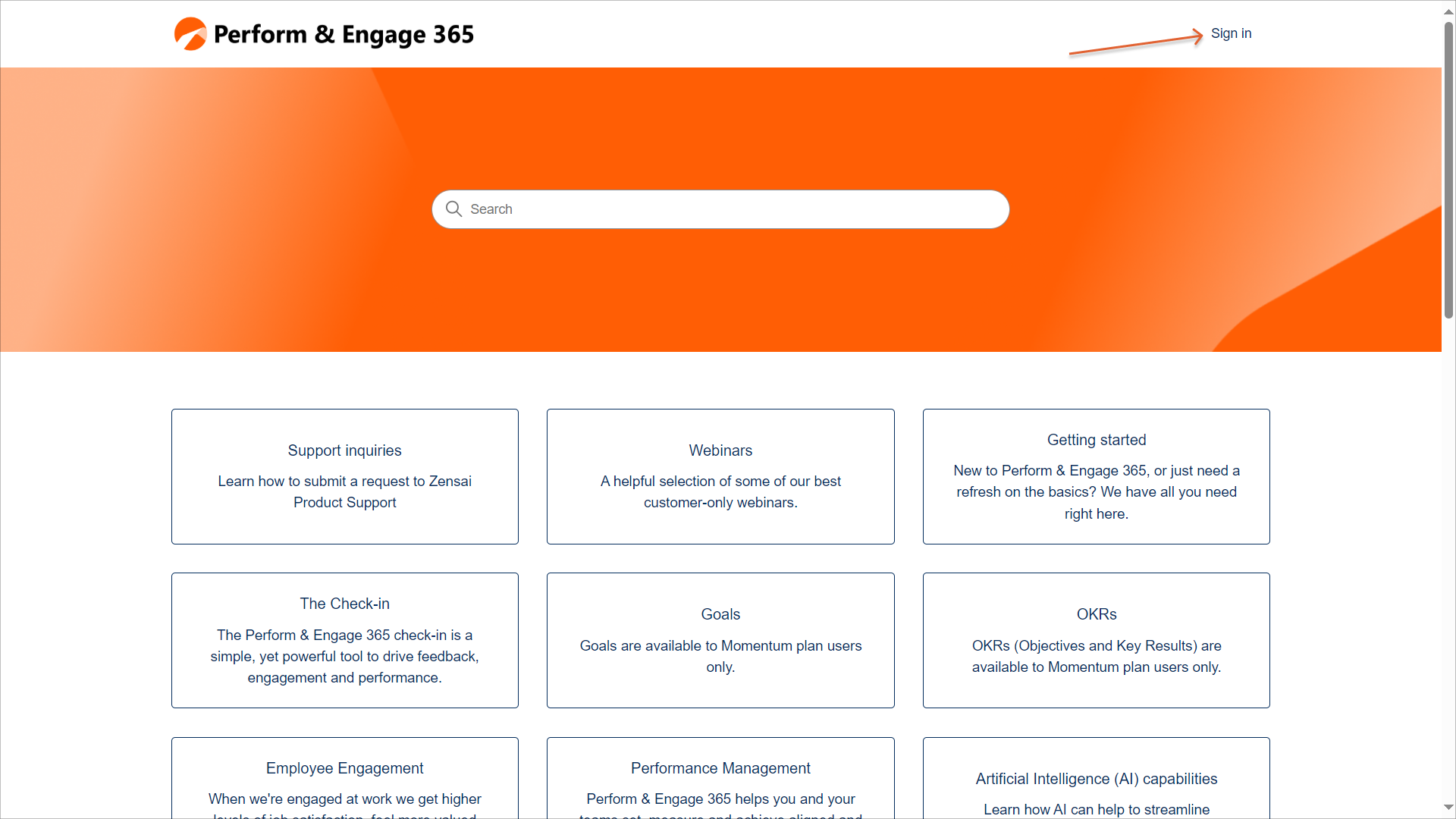 1. In the Perform & Engage 365 Help Center, select Sign in in the top right-hand corner of the page.