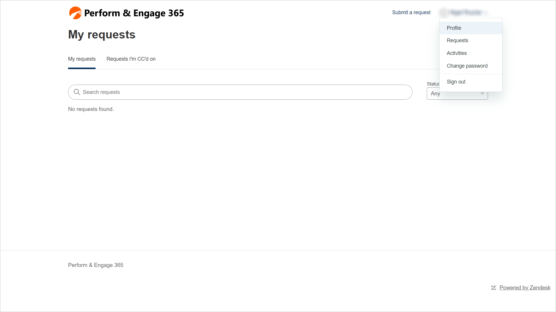 6. You can track and reply to your tickets from your profile in the Perform & Engage 365 Help Center. To do this, select Requests from the drop-down list next to your login name. The My requests page opens. Here, you can see all your requests, or those on which you were CC'd.