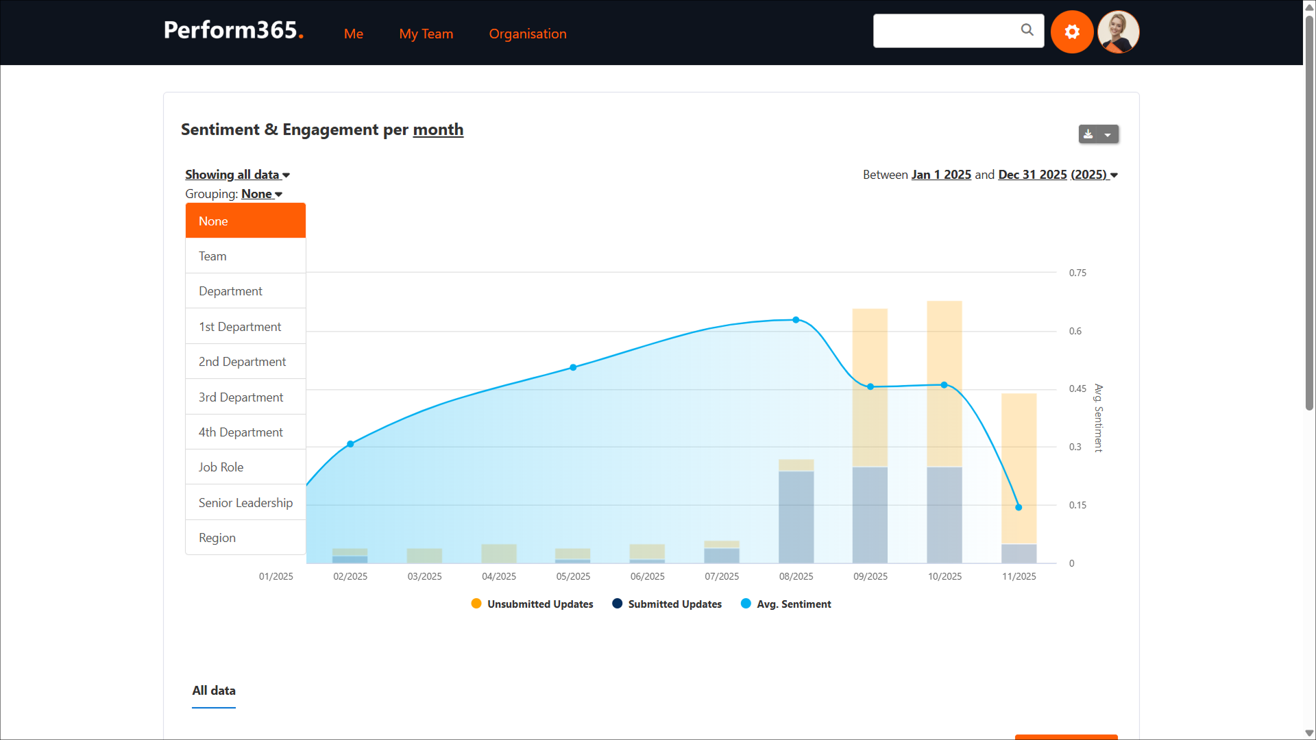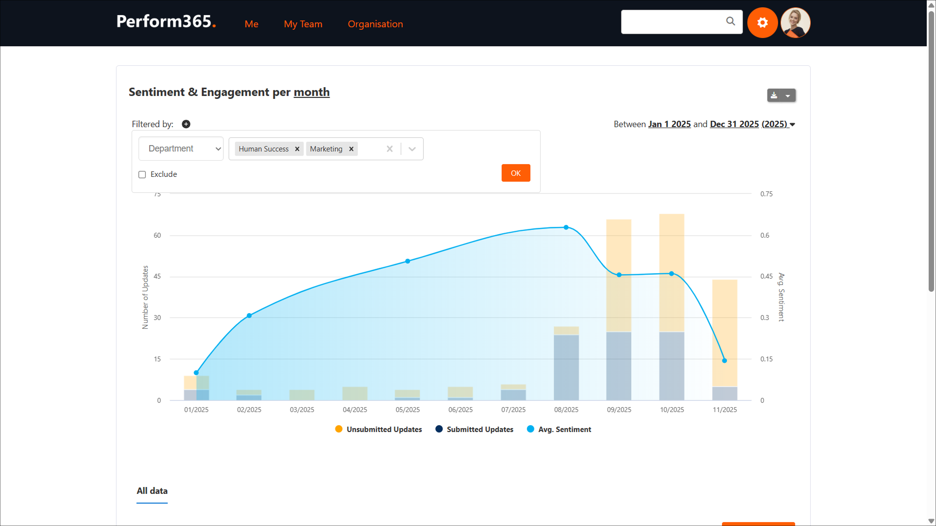 Perform & Engage 365 analyzes employees’ responses using machine learning and natural language processing algorithms, and calculates monthly average sentiment - a value that can be viewed in a chart, filtered by specific group or date, and tracked over time. By making qualitative data measurable, sentiment analysis enables managers to identify trends, address concerns before they escalate, and make informed business decisions.