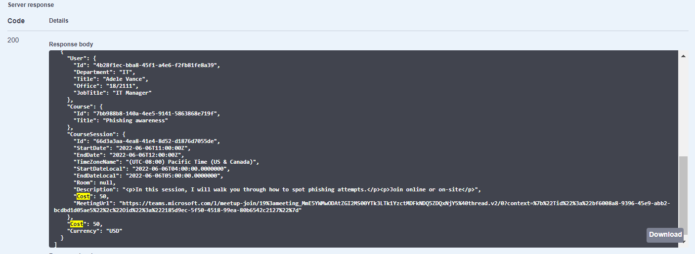 - In the Response body field you will see the list of course sessions of the tenant where cost per session is set, including the data about the enrolled users and cost per learner and per session.