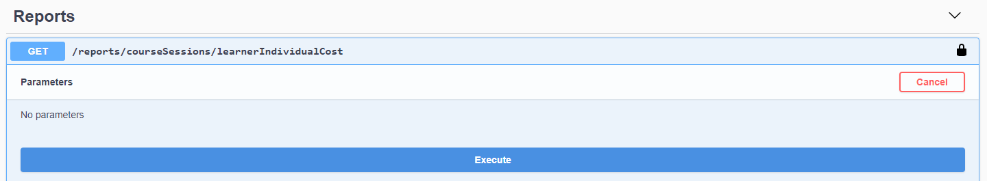 2. Find the Reports section, expand it, find the GET method /reports/courseSessions/learnerIndividualCost and then select Try it out in the top left corner.