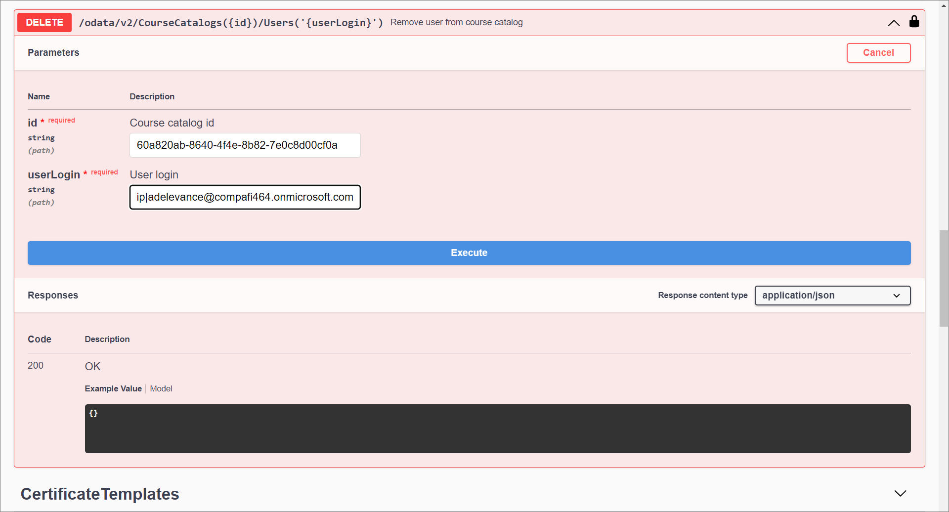 2. Select the DELETE /odata/v2/CourseCatalogs({id})/Users('{userLogin}') endpoint that removes a user from a course catalog and select Try it out.