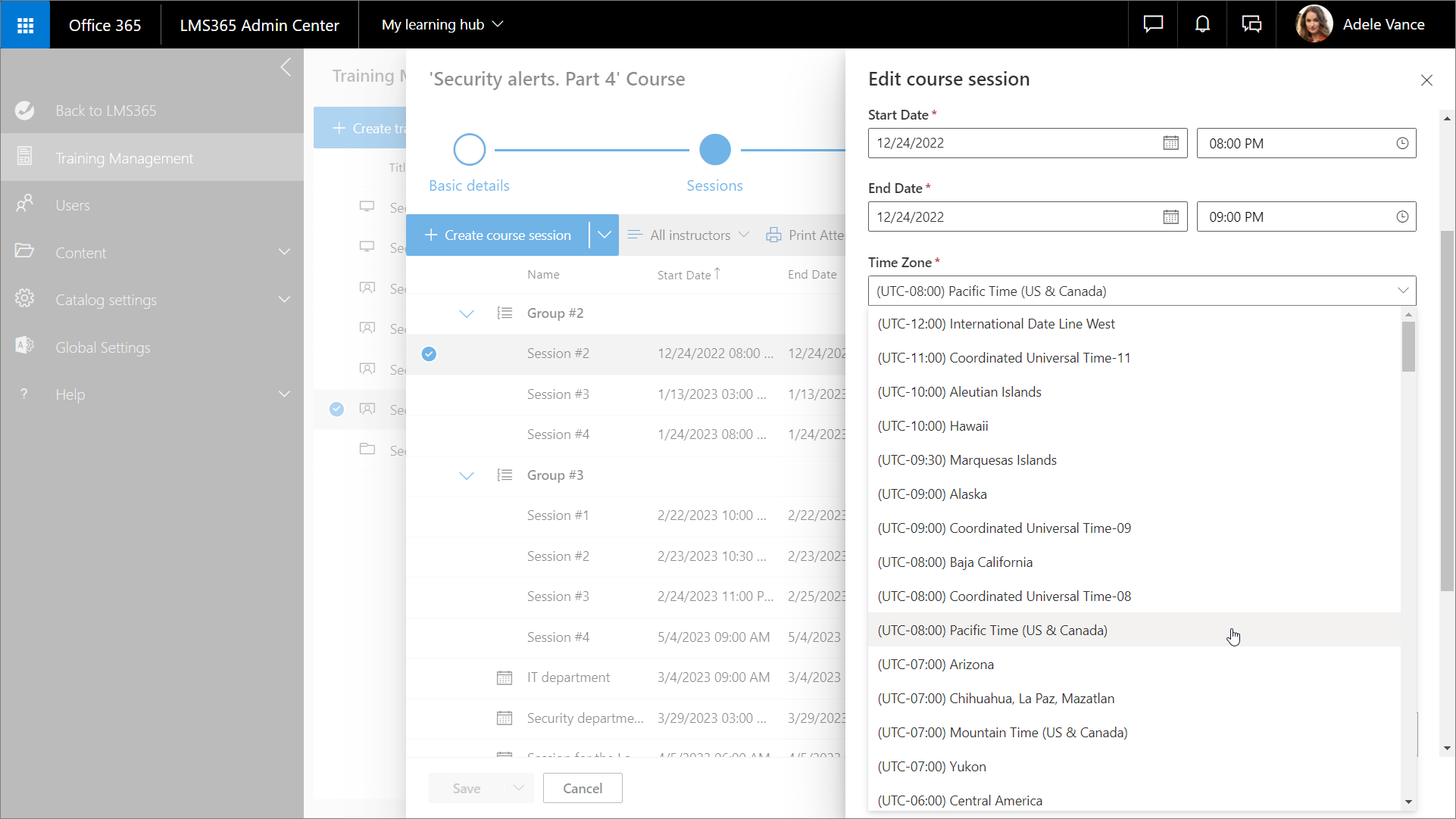 4. On the opened Edit course session panel, select the relevant time zone from Time Zone drop-down list. This time zone is used in relevant notifications and reports for the selected session and affects the display of the start and end dates in the session details on the course home page.