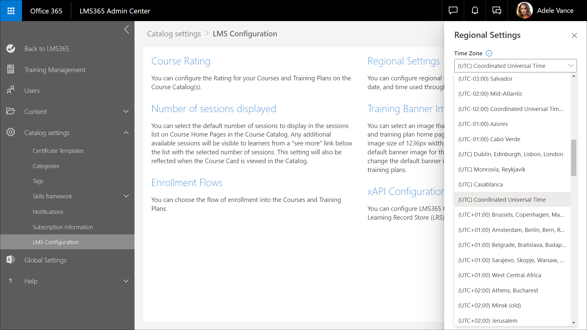 3. On the opened Regional Settings panel, select the relevant time zone from the Time Zone drop-down list. This time zone is used when showing time in notifications and reports of the selected course catalog. Find more information about the catalog Regional Settings in this article.