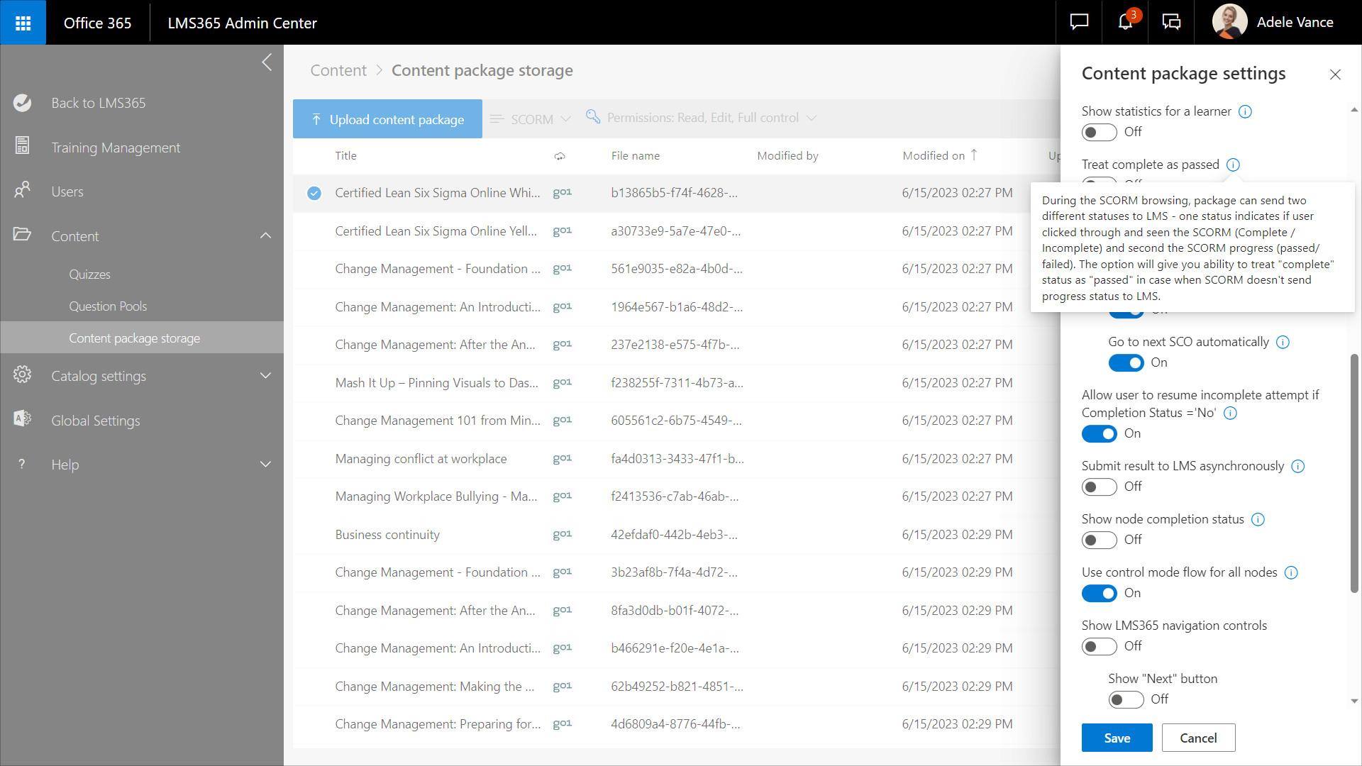 1. Go to Learn365 Admin Center > Content > Content Package Storage > select the required SCORM and select Edit Content Package from the Actions panel.