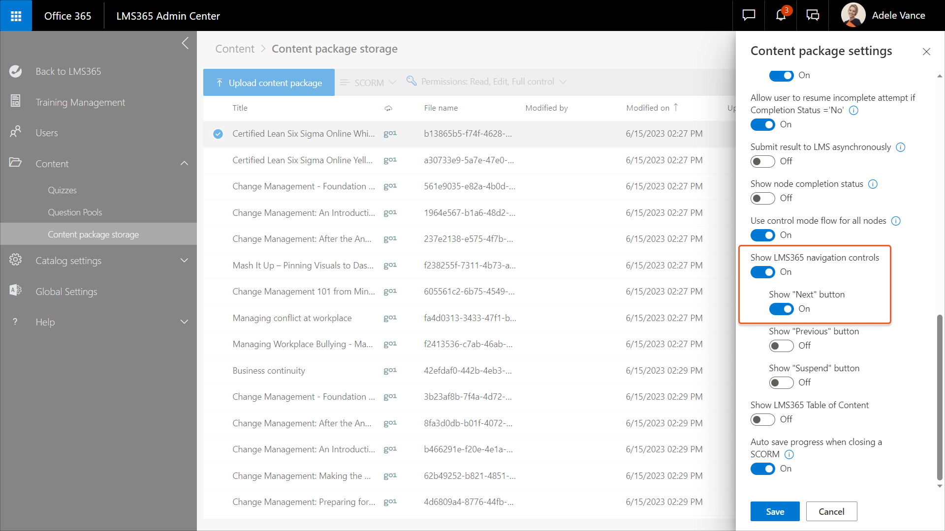 - If the Next button isn't displayed, check that the Show "Next" button toggle is set to On under Show Learn365 navigation controls.