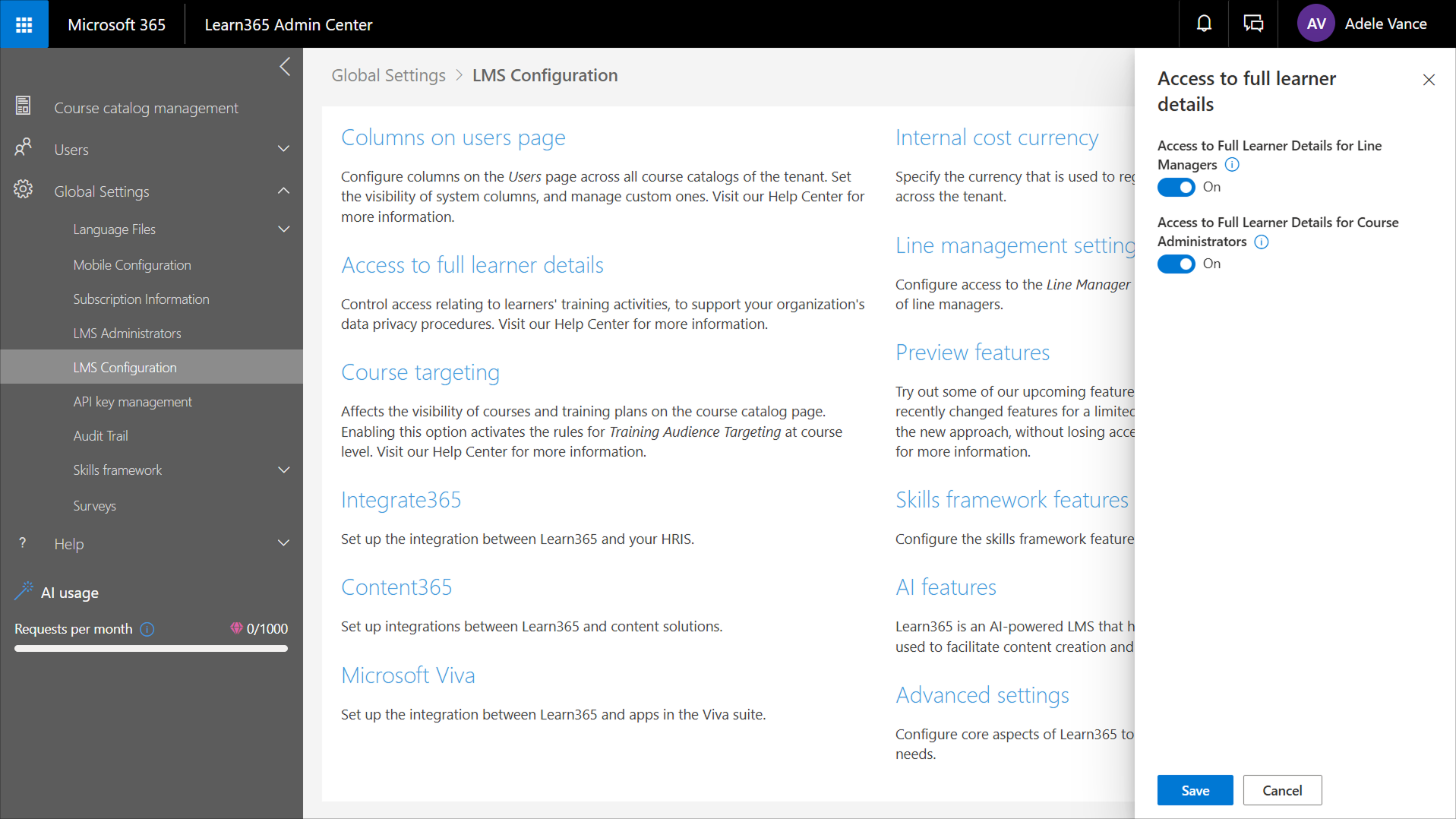 1. In the Learn365 Admin Center, go to > Global Settings > LMS Configuration > Access to full learner details.
